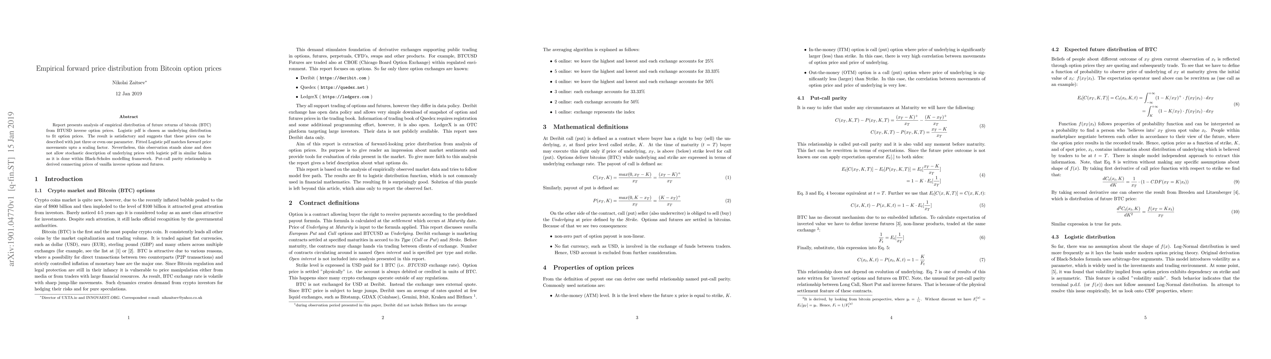 Report presents analysis of empirical distribution of future returns of bitcoin (BTC) from BTUSD inverse option prices. Logistic pdf is chosen as underlying distribution to fit option prices. The result is satisfactory and suggests that these prices can be described with just three or even one parameter. Fitted Logistic pdf matches forward price movements upto a scaling factor. Nevertheless, this observation stands alone and does not allow stochastic description of underlying prices with logistic pdf in similar fashion as it is done within Black-Scholes modelling framework. Put-call parity relationship is derived connecting prices of vanilla inverse options and futures.