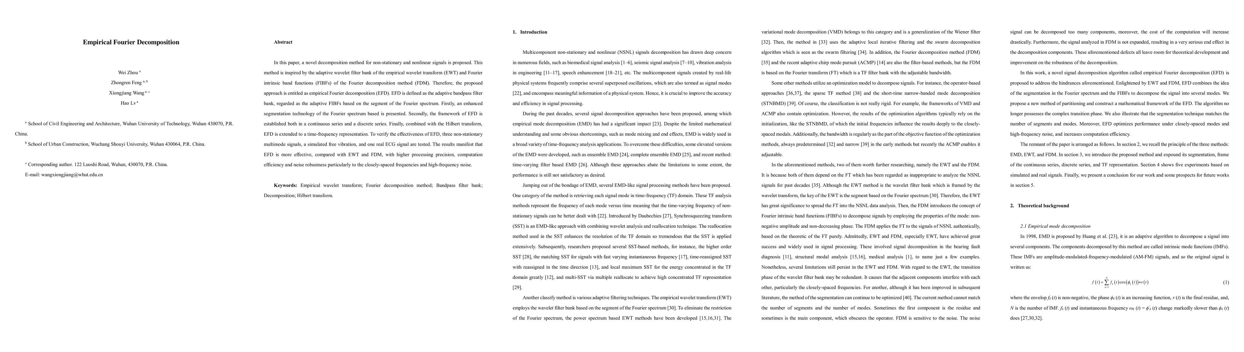 This paper introduces empirical Fourier decomposition (EFD), a novel adaptive bandpass filter method for analyzing non-stationary and nonlinear signals. EFD combines the adaptive wavelet filter bank of EWT with Fourier intrinsic band functions, demonstrating higher precision, efficiency, and noise robustness compared to EWT and traditional Fourier decomposition.