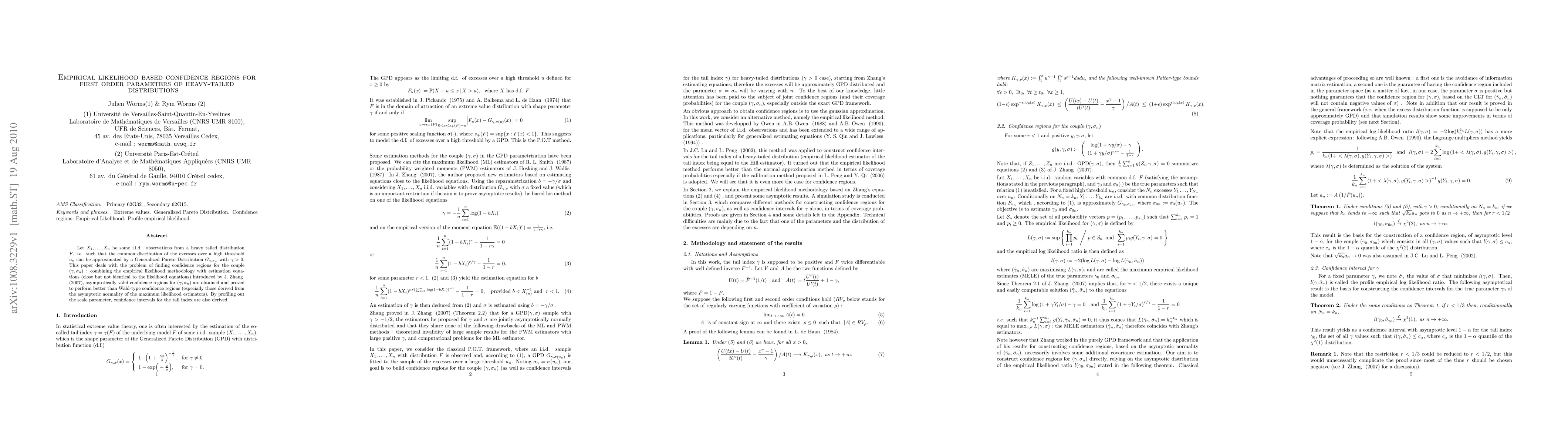 This paper develops empirical likelihood-based confidence regions for the first-order parameters $(\gamma, \sigma_n)$ of a heavy-tailed distribution, outperforming traditional Wald-type regions. It uses estimation equations introduced by J. Zhang and profiles out the scale parameter to derive confidence intervals for the tail index.