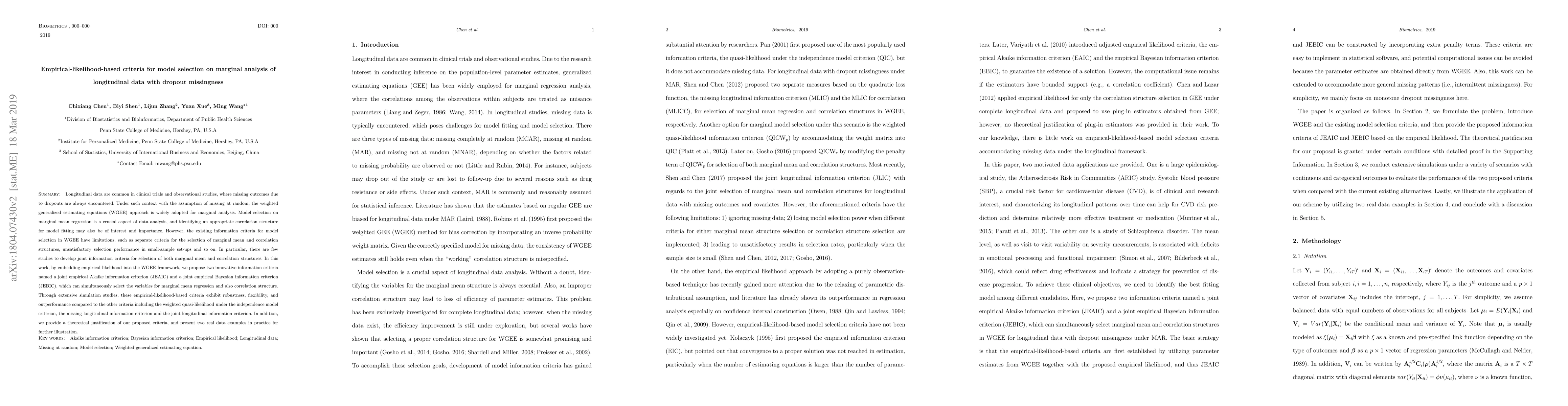 This paper proposes two new empirical-likelihood-based criteria, JEAIC and JEBIC, for joint model selection in weighted generalized estimating equations (WGEE) for longitudinal data with dropout missingness. These criteria outperform existing methods in simulations and provide a robust framework for selecting both marginal mean and correlation structures.