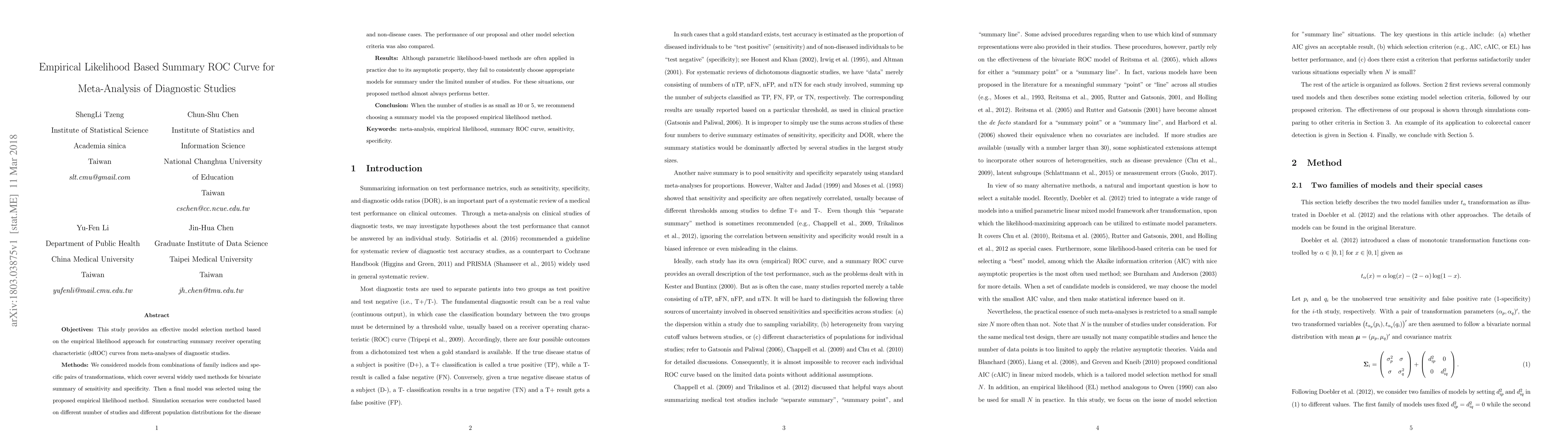 This paper proposes an empirical likelihood-based method for selecting the best model for constructing summary ROC curves in meta-analyses of diagnostic studies, outperforming traditional parametric methods, especially when the number of studies is limited. The method is shown to be effective through simulation studies comparing different population distributions.