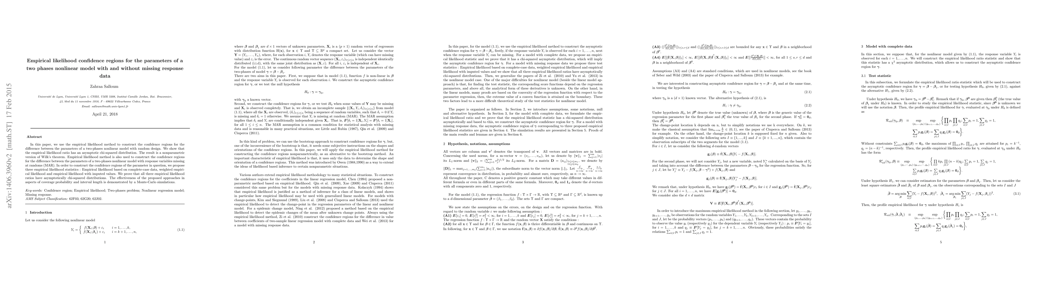 This paper constructs empirical likelihood confidence regions for parameters in a two-phases nonlinear model, addressing both complete and missing response data scenarios. It demonstrates the asymptotic chi-squared distribution of the empirical likelihood ratio and evaluates the effectiveness of proposed methods via Monte-Carlo simulations.