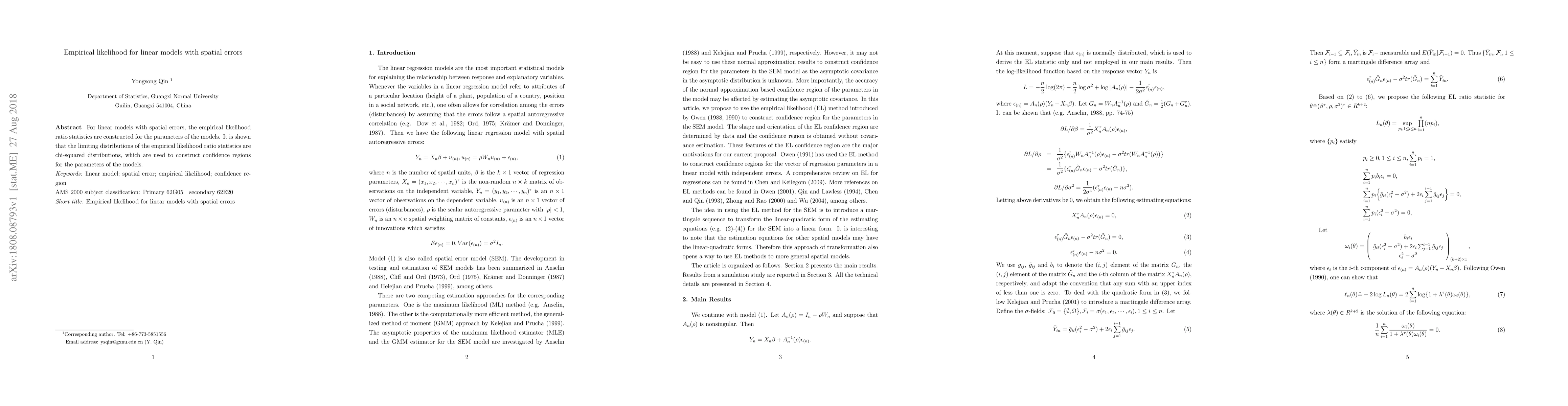 For linear models with spatial errors, the empirical likelihood ratio statistics are constructed for the parameters of the models. It is shown that the limiting distributions of the empirical likelihood ratio statistics are chi-squared distributions, which are used to construct confidence regions for the parameters of the models.