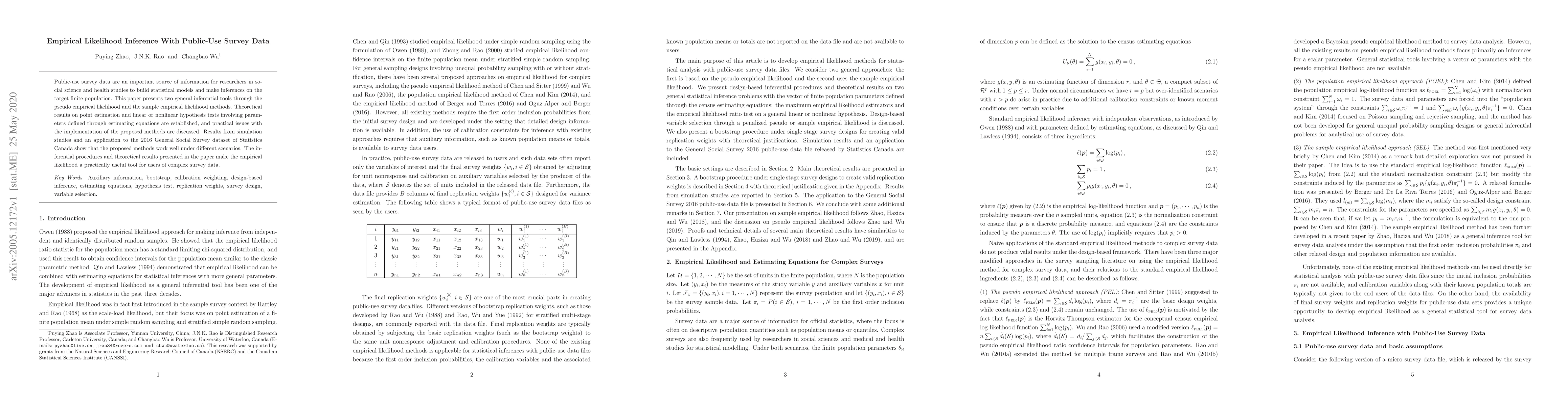 This paper introduces two inferential tools based on pseudo empirical likelihood and sample empirical likelihood for analyzing public-use survey data. It establishes theoretical results for point estimation and hypothesis testing, and demonstrates their effectiveness through simulations and an application to the 2016 General Social Survey dataset.