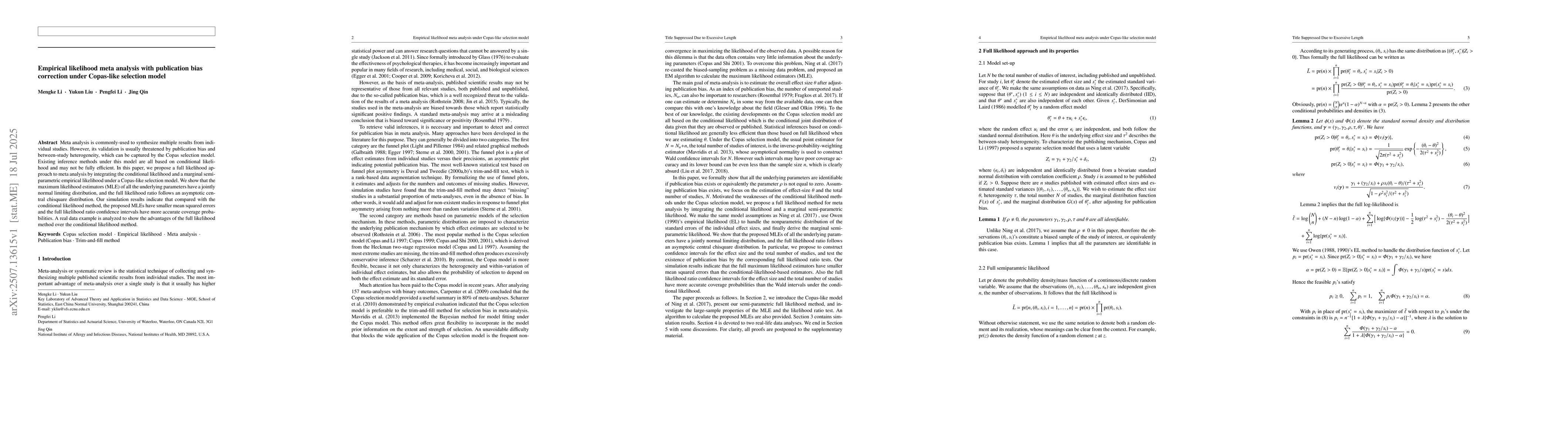 Meta analysis is commonly-used to synthesize multiple results from individual studies. However, its validation is usually threatened by publication bias and between-study heterogeneity, which can be captured by the Copas selection model. Existing inference methods under this model are all based on conditional likelihood and may not be fully efficient. In this paper, we propose a full likelihood approach to meta analysis by integrating the conditional likelihood and a marginal semi-parametric empirical likelihood under a Copas-like selection model. We show that the maximum likelihood estimators (MLE) of all the underlying parameters have a jointly normal limiting distribution, and the full likelihood ratio follows an asymptotic central chisquare distribution. Our simulation results indicate that compared with the conditional likelihood method, the proposed MLEs have smaller mean squared errors and the full likelihood ratio confidence intervals have more accurate coverage probabilities. A real data example is analyzed to show the advantages of the full likelihood method over the conditional likelihood method.