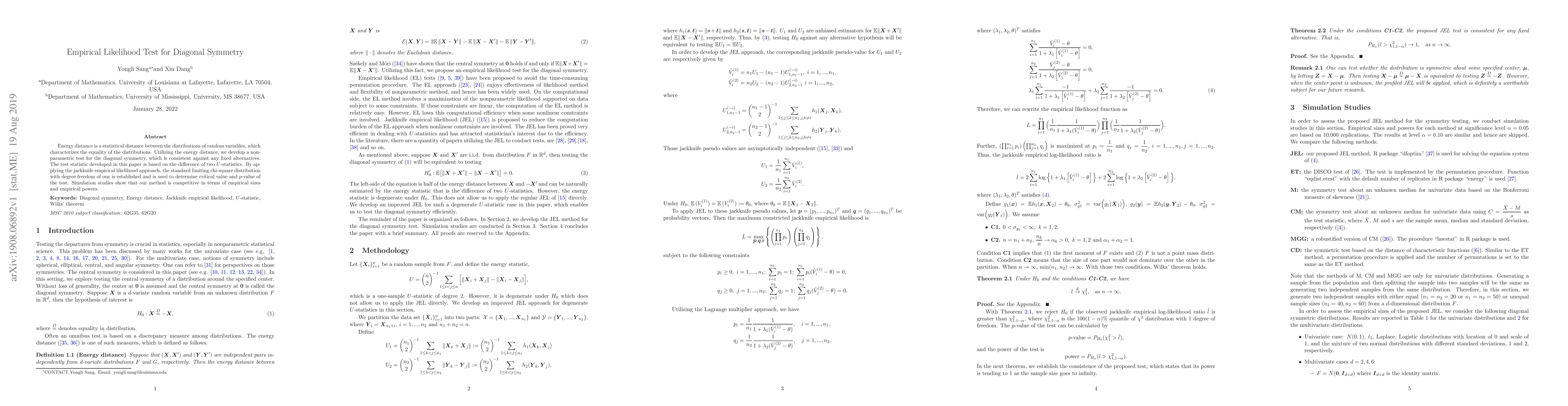 Energy distance is a statistical distance between the distributions of random variables, which characterizes the equality of the distributions. Utilizing the energy distance, we develop a nonparametric test for the diagonal symmetry, which is consistent against any fixed alternatives. The test statistic developed in this paper is based on the difference of two $U$-statistics. By applying the jackknife empirical likelihood approach, the standard limiting chi-square distribution with degree freedom of one is established and is used to determine critical value and $p$-value of the test. Simulation studies show that our method is competitive in terms of empirical sizes and empirical powers.
