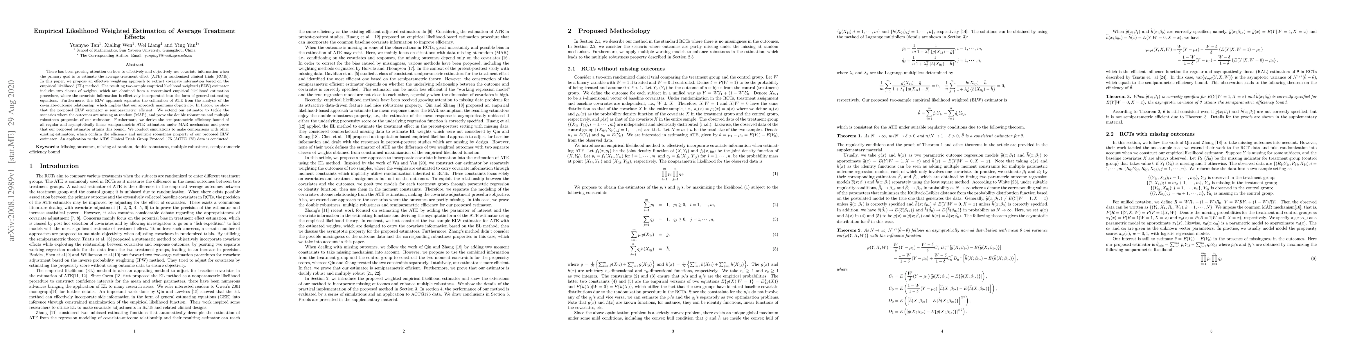 This research proposes a new method for estimating average treatment effects in randomized clinical trials that effectively incorporates covariate information using empirical likelihood weighted estimation. The approach is shown to be semiparametric efficient and attains the efficiency bound under missing at random mechanisms.