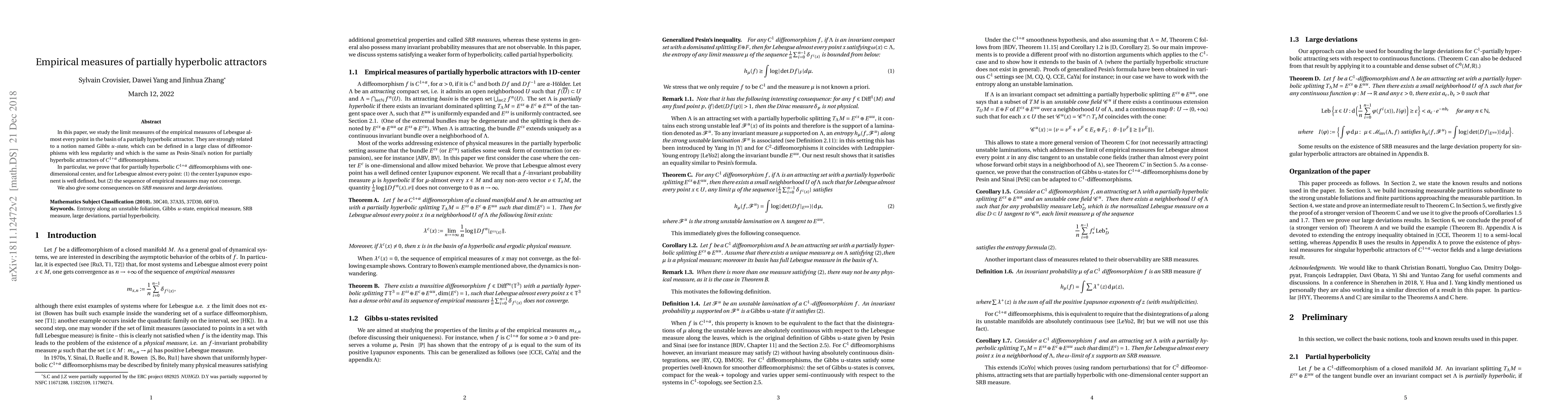 In this paper, we study the limit measures of the empirical measures of Lebesgue almost every point in the basin of a partially hyperbolic attractor. They are strongly related to a notion named Gibbs u-state, which can be defined in a large class of diffeomorphisms with less regularity and which is the same as Pesin-Sinai's notion for partially hyperbolic attractors of $C^{1+\alpha}$ diffeomorphisms. In particular, we prove that for partially hyperbolic $C^{1+\alpha}$ diffeomorphisms with one-dimensional center, and for Lebesgue almost every point: (1) the center Lyapunov exponent is well defined, but (2) the sequence of empirical measures may not converge. We also give some consequences on SRB measures and large deviations.