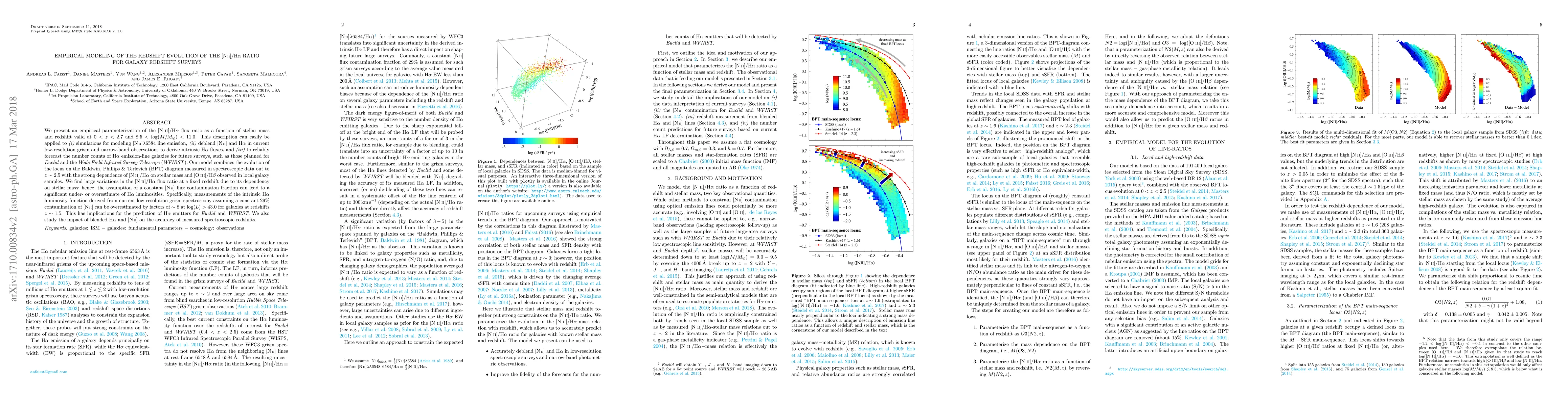 We present an empirical parameterization of the [NII]/H$\alpha$ flux ratio as a function of stellar mass and redshift valid at 0 < z < 2.7 and 8.5 < log(M) < 11.0. This description can easily be applied to (i) simulations for modeling [NII]$\lambda6584$ line emission, (ii) deblend [NII] and H$\alpha$ in current low-resolution grism and narrow-band observations to derive intrinsic H$\alpha$ fluxes, and (iii) to reliably forecast the number counts of H$\alpha$ emission-line galaxies for future surveys, such as those planned for Euclid and the Wide Field Infrared Survey Telescope (WFIRST). Our model combines the evolution of the locus on the Baldwin, Phillips & Terlevich (BPT) diagram measured in spectroscopic data out to z = 2.5 with the strong dependence of [NII]/H$\alpha$ on stellar mass and [OIII]/H$\beta$ observed in local galaxy samples. We find large variations in the [NII]/H$\alpha$ flux ratio at a fixed redshift due to its dependency on stellar mass; hence, the assumption of a constant [NII] flux contamination fraction can lead to a significant under- or overestimate of H$\alpha$ luminosities. Specifically, measurements of the intrinsic H$\alpha$ luminosity function derived from current low-resolution grism spectroscopy assuming a constant 29% contamination of [NII] can be overestimated by factors of ~8 at log(L) > 43.0 for galaxies at redshifts z = 1.5. This has implications for the prediction of H$\alpha$ emitters for Euclid and WFIRST. We also study the impact of blended H$\alpha$ and [NII] on the accuracy of measured spectroscopic redshifts.