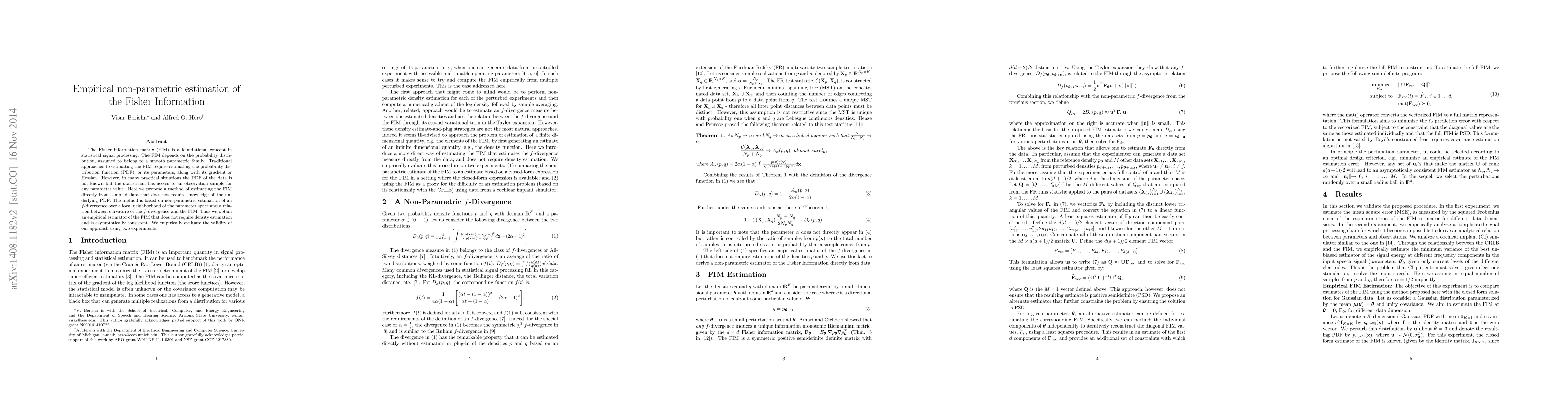 The Fisher information matrix (FIM) is a foundational concept in statistical signal processing. The FIM depends on the probability distribution, assumed to belong to a smooth parametric family. Traditional approaches to estimating the FIM require estimating the probability distribution function (PDF), or its parameters, along with its gradient or Hessian. However, in many practical situations the PDF of the data is not known but the statistician has access to an observation sample for any parameter value. Here we propose a method of estimating the FIM directly from sampled data that does not require knowledge of the underlying PDF. The method is based on non-parametric estimation of an $f$-divergence over a local neighborhood of the parameter space and a relation between curvature of the $f$-divergence and the FIM. Thus we obtain an empirical estimator of the FIM that does not require density estimation and is asymptotically consistent. We empirically evaluate the validity of our approach using two experiments.
