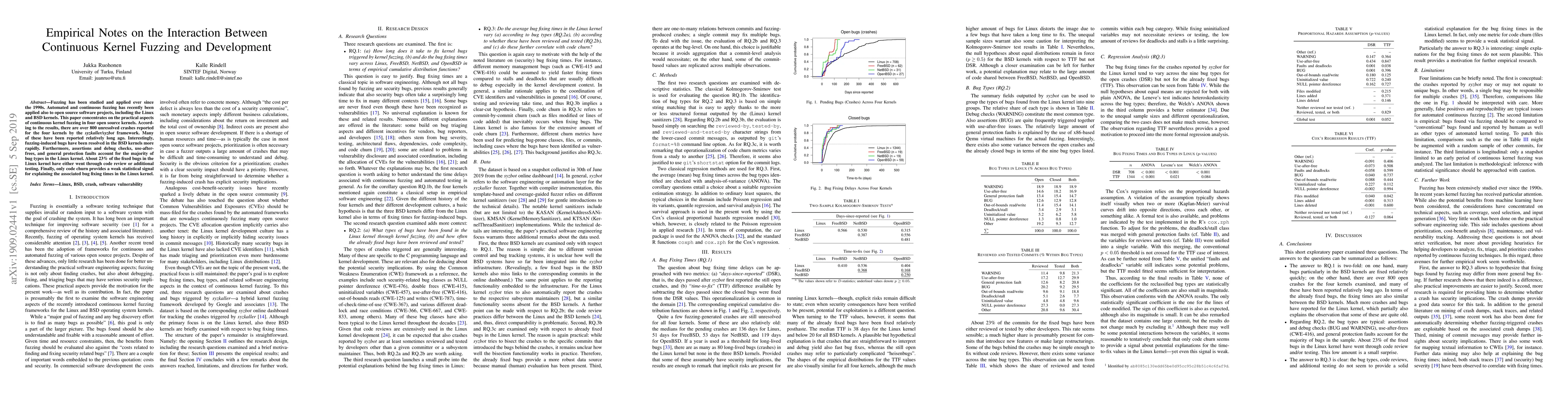 This paper examines continuous kernel fuzzing in four open source kernels, reporting over 800 unresolved crashes, with BSD kernels showing faster bug resolution. The majority of bugs in the Linux kernel are related to assertions, debug checks, and use-after-frees, with only 23% of fixed bugs undergoing code review or additional testing.