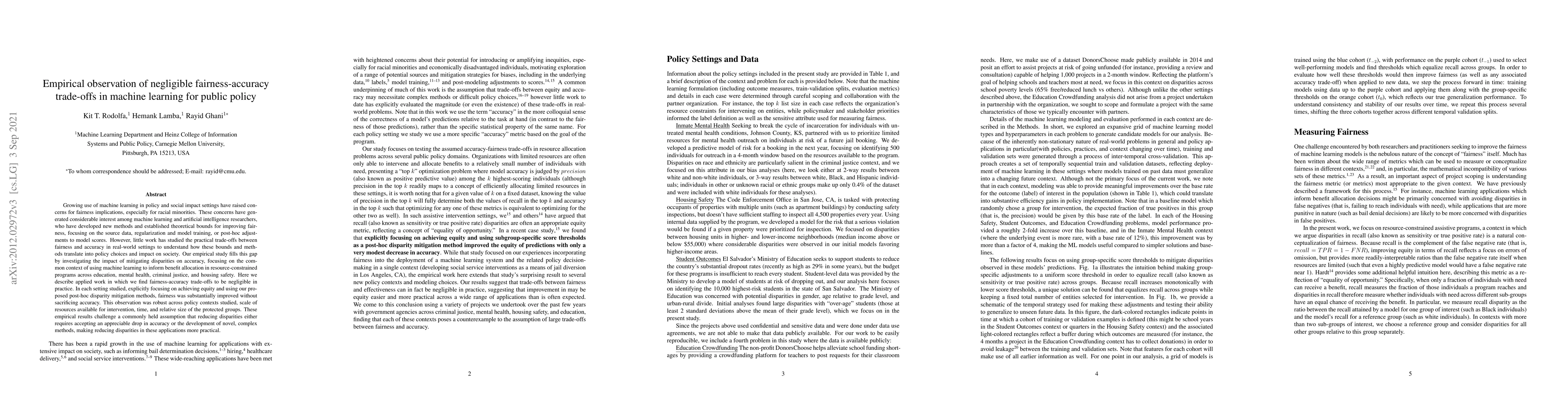 This research demonstrates negligible fairness-accuracy trade-offs in machine learning applications for public policy, showing that equity improvements can be achieved without sacrificing model accuracy across various domains like education and criminal justice. The study reveals that common disparity mitigation techniques effectively enhance fairness without harming predictive performance.