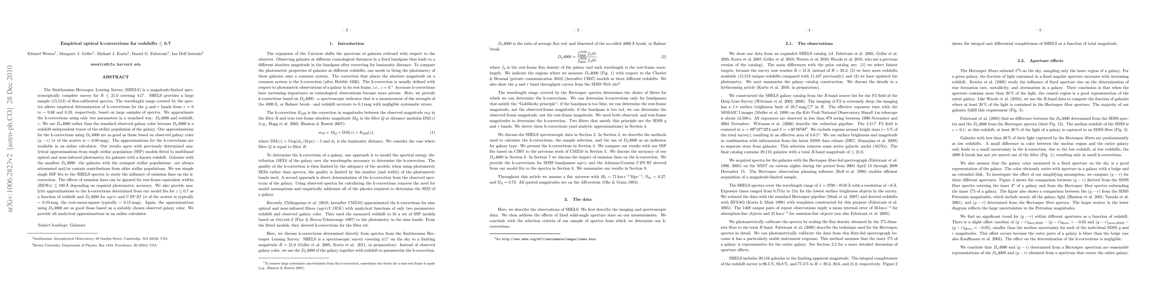 The Smithsonian Hectospec Lensing Survey (SHELS) is a magnitude limited spectroscopically complete survey for R<=21.0 covering 4 square degrees. SHELS provides a large sample (15,513) of flux calibrated spectra. The wavelength range covered by the spectra allows empirical determination of k-corrections for the g- and r-band from z=0 to ~0.68 and 0.33, respectively, based on large samples of spectra. We approximate the k-corrections using only two parameters in a standard way: Dn4000 and redshift. We use Dn4000 rather than the standard observed galaxy color because Dn4000 is a redshift independent tracer of the stellar population of the galaxy. Our approximations for the k-corrections using Dn4000 are as good as (or better than) those based on observed galaxy color (g-r) (sigma of the scatter is ~0.08 mag). The approximations for the k-corrections are available in an on-line calculator. Our results agree with previously determined analytical approximations from single stellar population (SSP) models fitted to multi-band optical and near-infrared photometry for galaxies with a known redshift. Galaxies with the smallest Dn4000-the galaxies with the youngest stellar populations-are always attenuated and/or contain contributions from older stellar populations. We use simple single SSP fits to the SHELS spectra to study the influence of emission lines on the k-correction. The effects of emission lines can be ignored for rest-frame equivalent widths <~ 100 A depending on required photometric accuracy. We also provide analytic approximations to the k-corrections determined from our model fits for z<=0.7 as a function of redshift and Dn4000 for ugriz and UBVRI (sigma of the scatter is typically ~0.10 mag). Again, the approximations using Dn4000 are as good (or better than) those based on a suitably chosen observed galaxy color. We provide all analytical approximations in an on-line calculator.