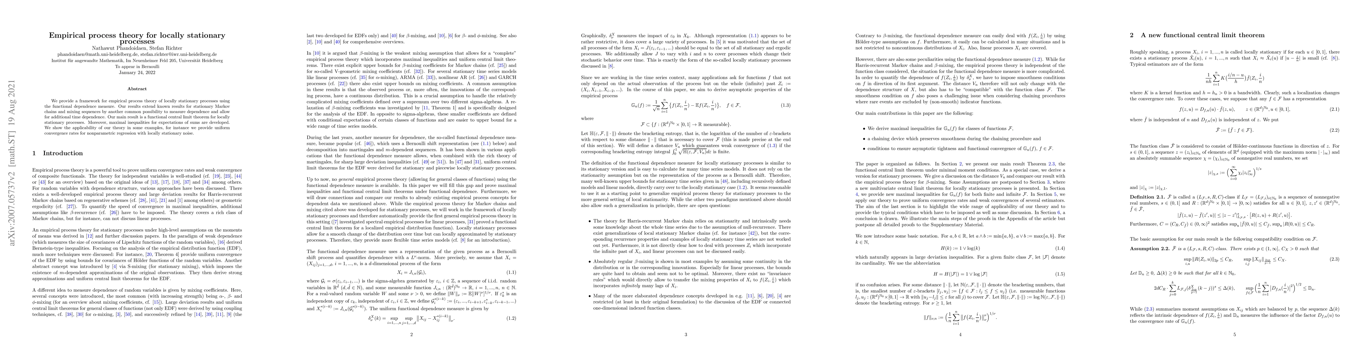 This paper develops a framework for empirical process theory in locally stationary processes using functional dependence measures, extending results for stationary Markov chains and mixing sequences. The main result is a functional central limit theorem for these processes, along with maximal inequalities for sums, and demonstrates its application in nonparametric regression with locally stationary noise.