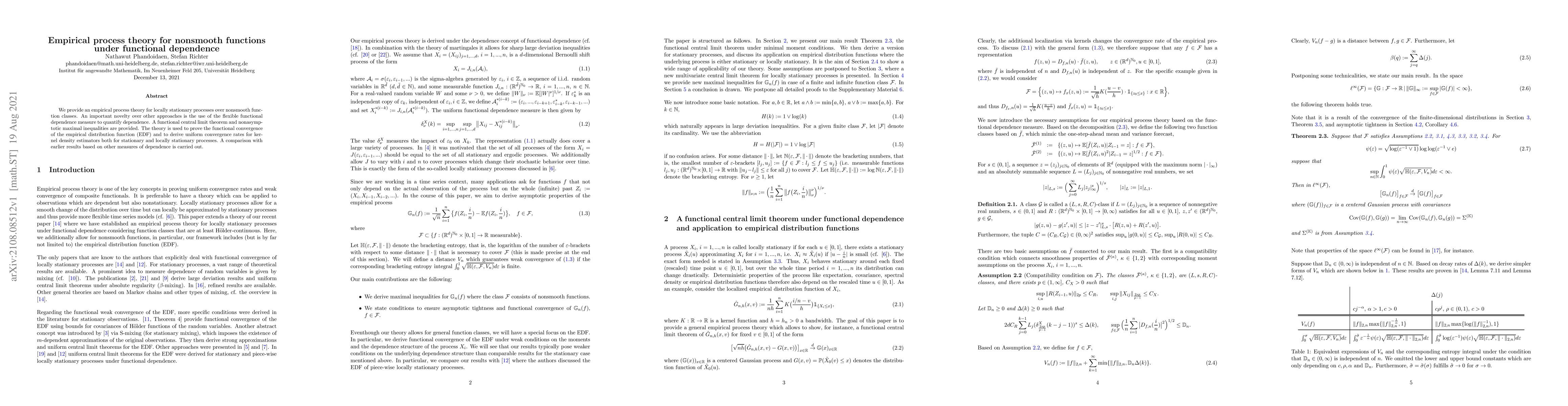 This paper develops an empirical process theory for nonsmooth function classes using a flexible functional dependence measure, establishing a functional central limit theorem and nonasymptotic maximal inequalities. It applies the theory to prove functional convergence of the empirical distribution function and derive uniform convergence rates for kernel density estimators.