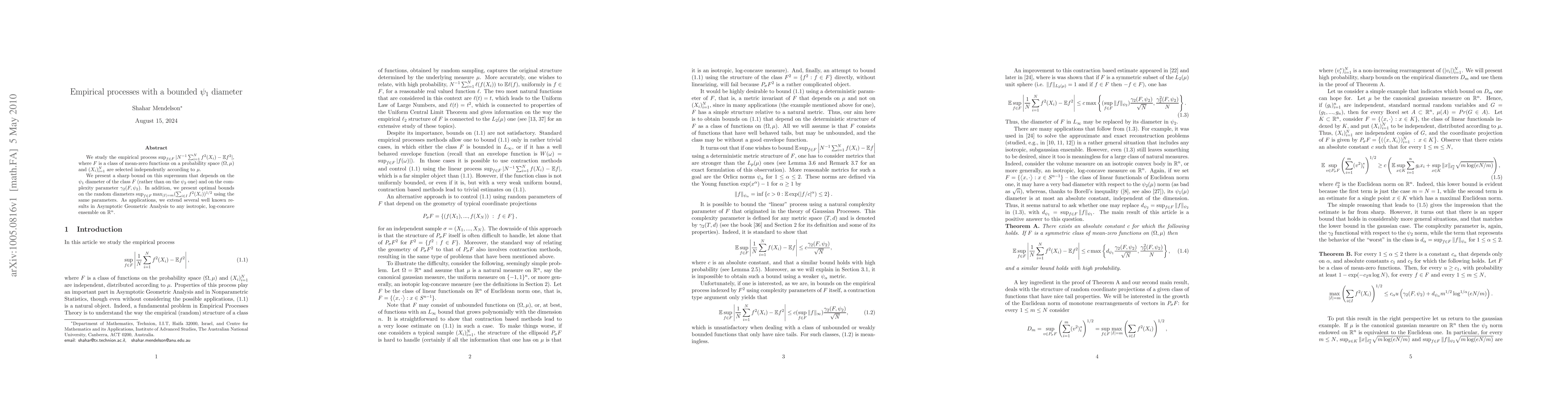 We study the empirical process indexed by F^2=\{f^2 : f \in F\}, where F is a class of mean-zero functions on a probability space. We present a sharp bound on the supremum of that process which depends on the \psi_1 diameter of the class F (rather than on the \psi_2 one) and on the complexity parameter \gamma_2(F,\psi_2). In addition, we present optimal bounds on the random diameters \sup_{f \in F} \max_{|I|=m} (\sum_{i \in I} f^2(X_i))^{1/2} using the same parameters. As applications, we extend several well known results in Asymptotic Geometric Analysis to any isotropic, log-concave ensemble on R^n.