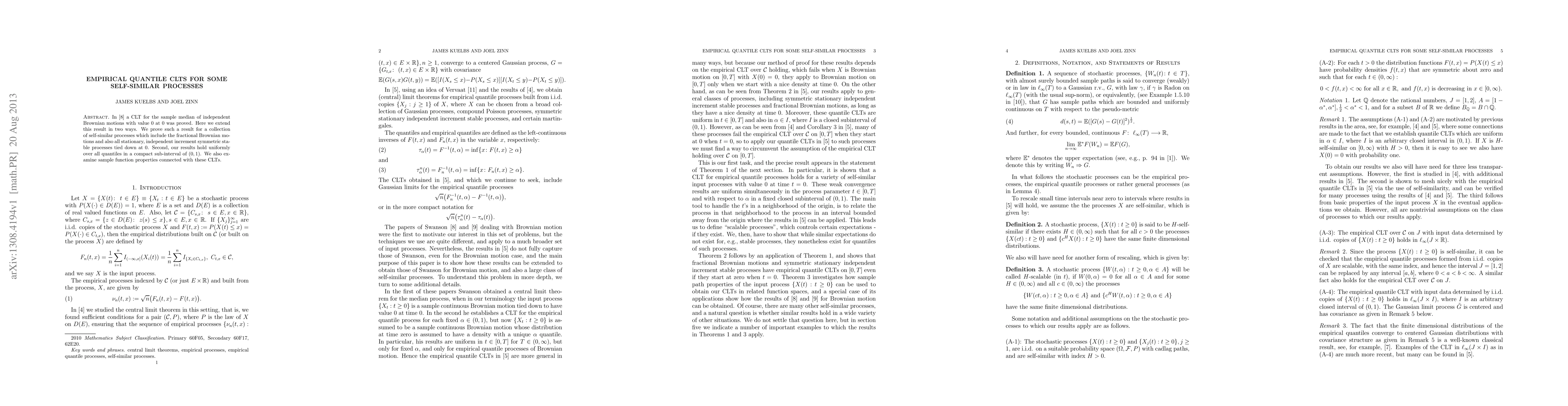 In a paper of Jason Swanson, a CLT for the sample median of independent Brownian motions with value 0 at 0 was proved. Here we extend this result in two ways. We prove such a result for a collection of self-similar processes which include the fractional Brownian motions, all stationary, independent increment symmetric stable processes tied down at 0 as well as iterated and integrated Brownian motions. Second, our results hold uniformly over all quantiles in a compact sub-interval of (0,1). We also examine sample function properties connected with these CLTs.
