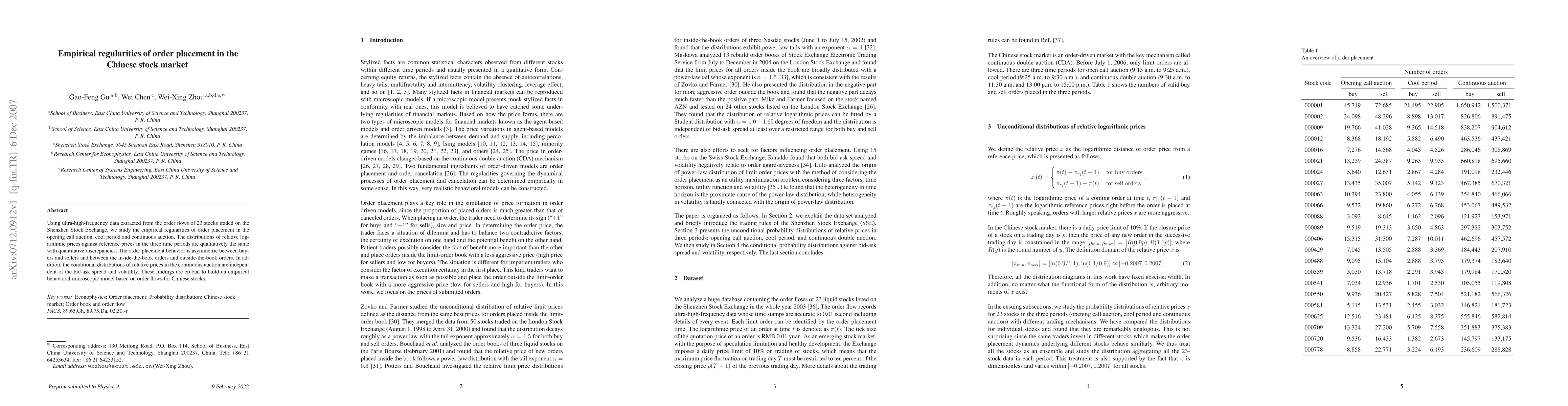 This paper analyzes ultra-high-frequency order flow data from 23 stocks on the Shenzhen Stock Exchange, revealing consistent patterns in order placement across different trading periods with notable asymmetries between buyer and seller behaviors. The findings suggest that relative price distributions are unaffected by bid-ask spread and volatility in continuous auctions, providing valuable insights for developing behavioral models of Chinese stock market order flows.