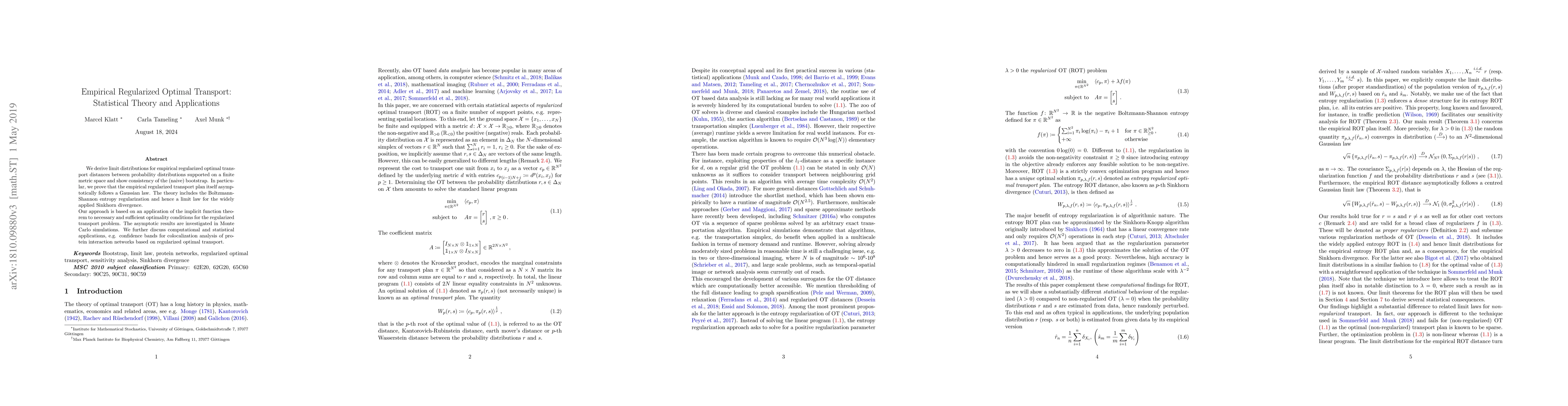 This paper develops statistical theory for empirical regularized optimal transport, proving consistency and deriving limit distributions, including a Gaussian law for the empirical transport plan. It applies the theory to the Sinkhorn divergence and discusses computational applications like confidence bands for protein interaction networks.