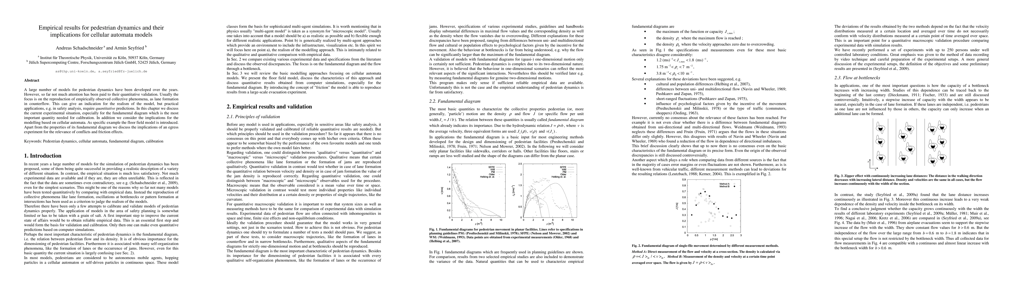 This paper evaluates empirical data on pedestrian dynamics to validate cellular automata models, focusing on the fundamental diagram for calibration. It highlights the importance of quantitative predictions for practical applications and discusses the floor field model's implications, including conflict and friction effects in egress experiments.