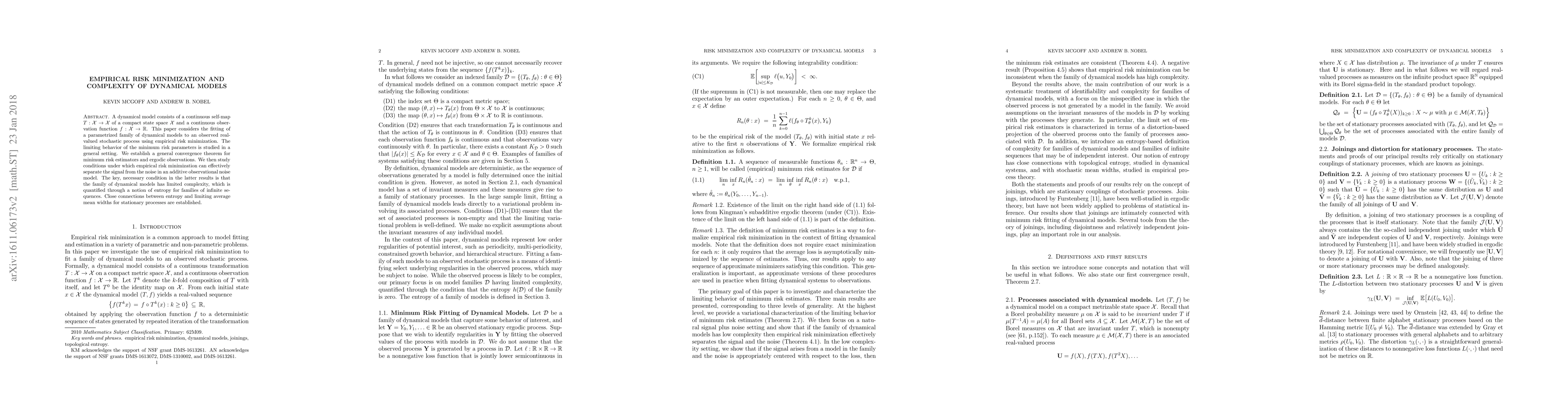 A dynamical model consists of a continuous self-map $T: \mathcal{X} \to \mathcal{X}$ of a compact state space $\mathcal{X}$ and a continuous observation function $f: \mathcal{X} \to \mathbb{R}$. This paper considers the fitting of a parametrized family of dynamical models to an observed real-valued stochastic process using empirical risk minimization. The limiting behavior of the minimum risk parameters is studied in a general setting. We establish a general convergence theorem for minimum risk estimators and ergodic observations. We then study conditions under which empirical risk minimization can effectively separate the signal from the noise in an additive observational noise model. The key, necessary condition in the latter results is that the family of dynamical models has limited complexity, which is quantified through a notion of entropy for families of infinite sequences. Close connections between entropy and limiting average mean widths for stationary processes are established.