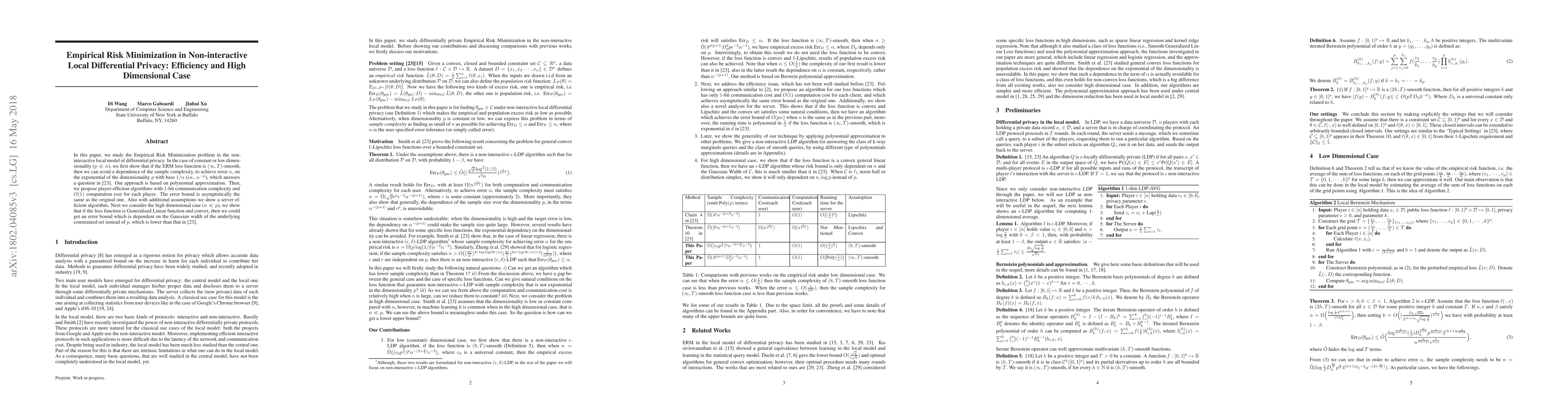 This paper investigates Empirical Risk Minimization in non-interactive local differential privacy, achieving efficient error bounds without exponential dependence on dimensionality for low-dimensional cases. For high-dimensional scenarios, it proposes an error bound based on Gaussian width instead of dimensionality.