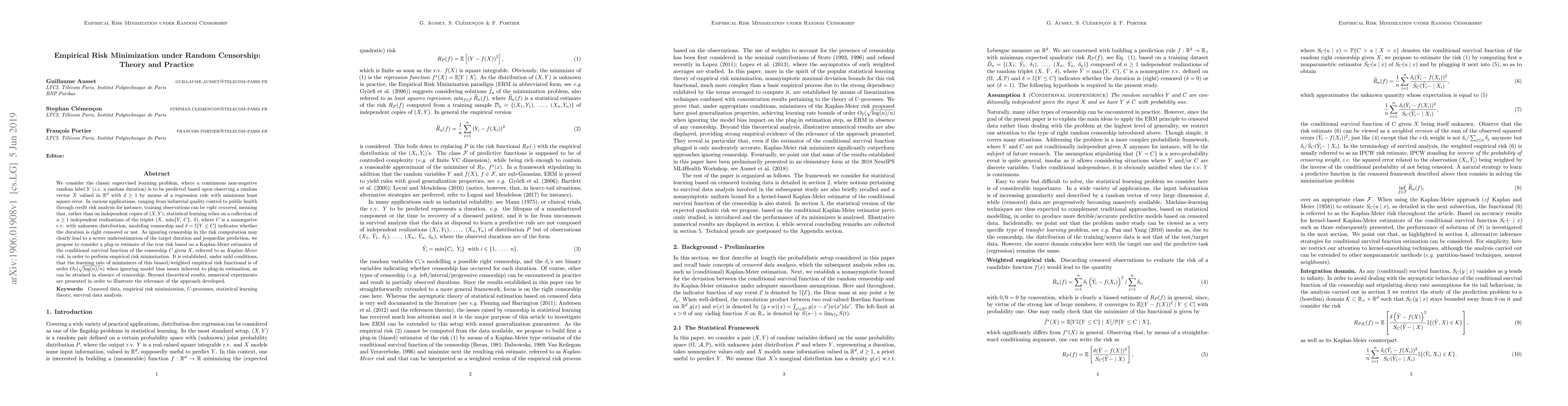 We consider the classic supervised learning problem, where a continuous non-negative random label $Y$ (i.e. a random duration) is to be predicted based upon observing a random vector $X$ valued in $\mathbb{R}^d$ with $d\geq 1$ by means of a regression rule with minimum least square error. In various applications, ranging from industrial quality control to public health through credit risk analysis for instance, training observations can be right censored, meaning that, rather than on independent copies of $(X,Y)$, statistical learning relies on a collection of $n\geq 1$ independent realizations of the triplet $(X, \; \min\{Y,\; C\},\; \delta)$, where $C$ is a nonnegative r.v. with unknown distribution, modeling censorship and $\delta=\mathbb{I}\{Y\leq C\}$ indicates whether the duration is right censored or not. As ignoring censorship in the risk computation may clearly lead to a severe underestimation of the target duration and jeopardize prediction, we propose to consider a plug-in estimate of the true risk based on a Kaplan-Meier estimator of the conditional survival function of the censorship $C$ given $X$, referred to as Kaplan-Meier risk, in order to perform empirical risk minimization. It is established, under mild conditions, that the learning rate of minimizers of this biased/weighted empirical risk functional is of order $O_{\mathbb{P}}(\sqrt{\log(n)/n})$ when ignoring model bias issues inherent to plug-in estimation, as can be attained in absence of censorship. Beyond theoretical results, numerical experiments are presented in order to illustrate the relevance of the approach developed.