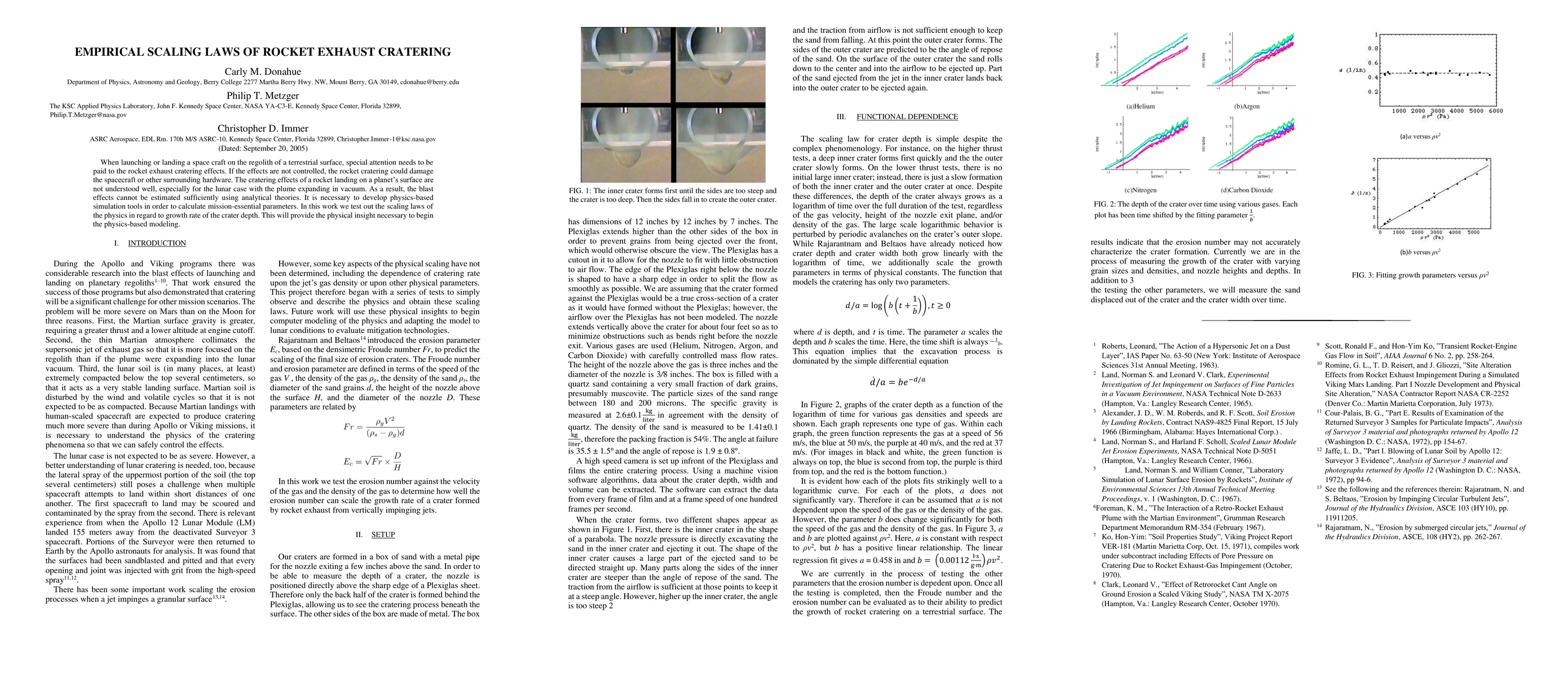 This paper investigates the empirical scaling laws governing rocket exhaust cratering on planetary regolith, focusing on the growth rate of crater depth. It aims to develop physics-based simulation tools to predict cratering effects, which are crucial for spacecraft landing and launching, especially in vacuum conditions like the Moon.