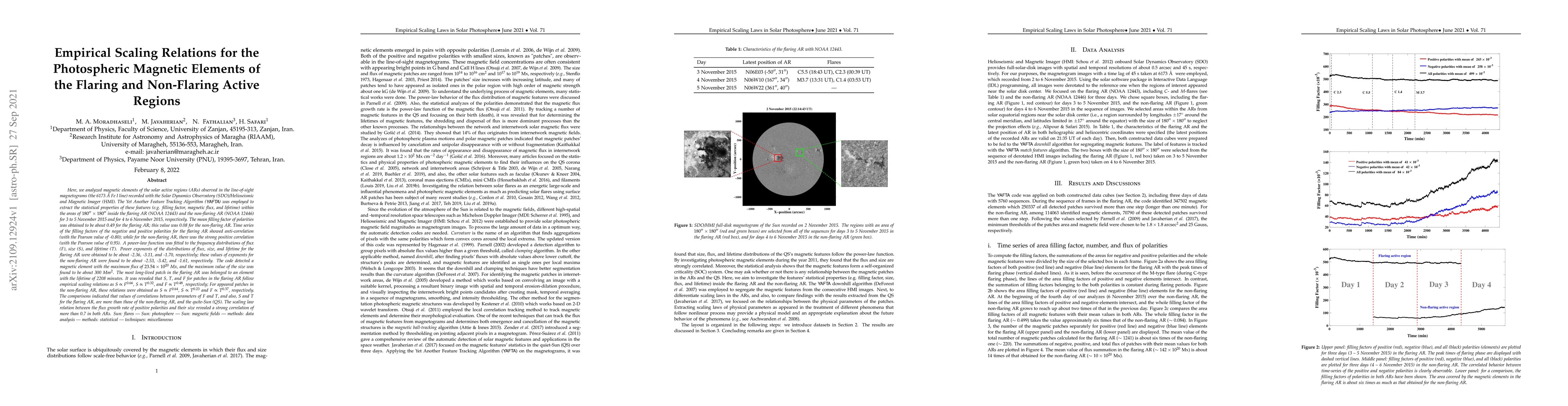 This study analyzes magnetic elements in solar active regions using magnetograms from the SDO/HMI, finding significant differences in filling factors and correlations between polarities in flaring versus non-flaring regions. Power-law scaling relations for flux, size, and lifetime were derived for both regions.