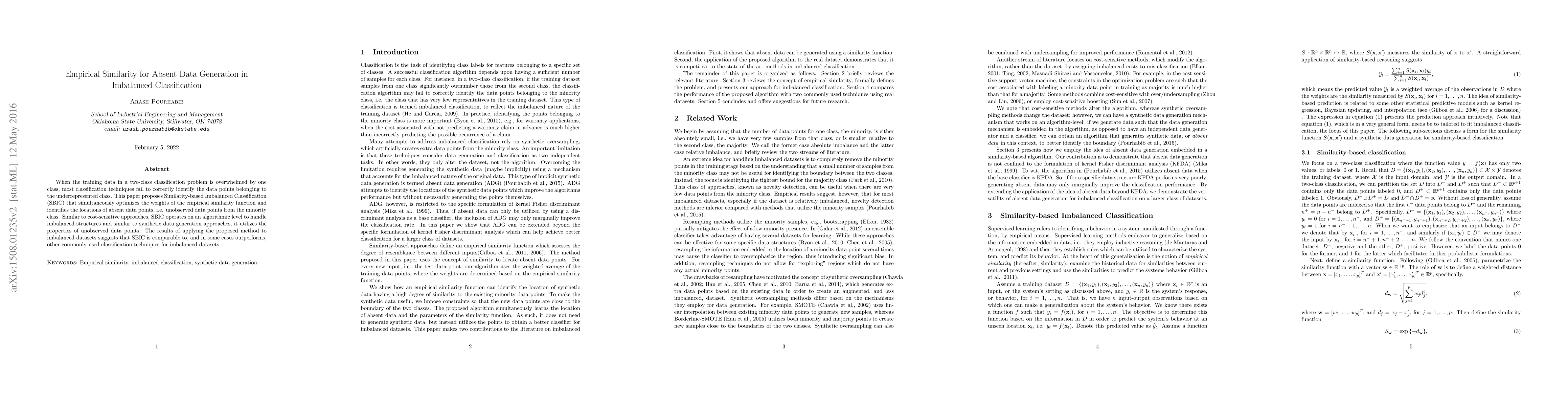 When the training data in a two-class classification problem is overwhelmed by one class, most classification techniques fail to correctly identify the data points belonging to the underrepresented class. We propose Similarity-based Imbalanced Classification (SBIC) that learns patterns in the training data based on an empirical similarity function. To take the imbalanced structure of the training data into account, SBIC utilizes the concept of absent data, i.e. data from the minority class which can help better find the boundary between the two classes. SBIC simultaneously optimizes the weights of the empirical similarity function and finds the locations of absent data points. As such, SBIC uses an embedded mechanism for synthetic data generation which does not modify the training dataset, but alters the algorithm to suit imbalanced datasets. Therefore, SBIC uses the ideas of both major schools of thoughts in imbalanced classification: Like cost-sensitive approaches SBIC operates on an algorithm level to handle imbalanced structures; and similar to synthetic data generation approaches, it utilizes the properties of unobserved data points from the minority class. The application of SBIC to imbalanced datasets suggests it is comparable to, and in some cases outperforms, other commonly used classification techniques for imbalanced datasets.