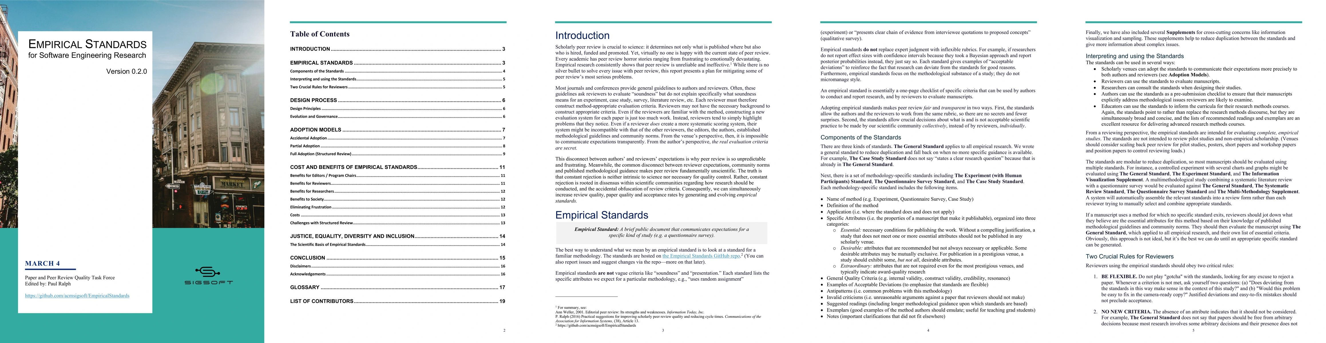 Empirical Standards are natural-language models of a scientific community's expectations for a specific kind of study (e.g. a questionnaire survey). The ACM SIGSOFT Paper and Peer Review Quality Initiative generated empirical standards for research methods commonly used in software engineering. These living documents, which should be continuously revised to reflect evolving consensus around research best practices, will improve research quality and make peer review more effective, reliable, transparent and fair.
