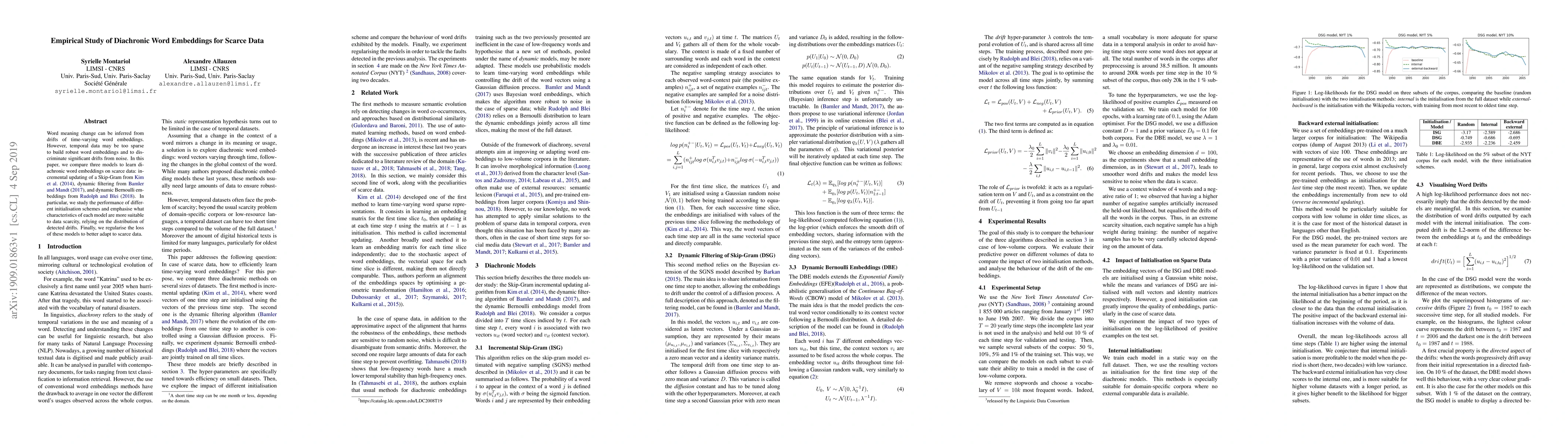 This study compares three models—incremental Skip-Gram, dynamic filtering, and dynamic Bernoulli embeddings—to learn diachronic word embeddings from scarce temporal data. It examines different initialization schemes and identifies which model characteristics best handle data scarcity, assessing performance based on the distribution of detected drifts and loss regularization.