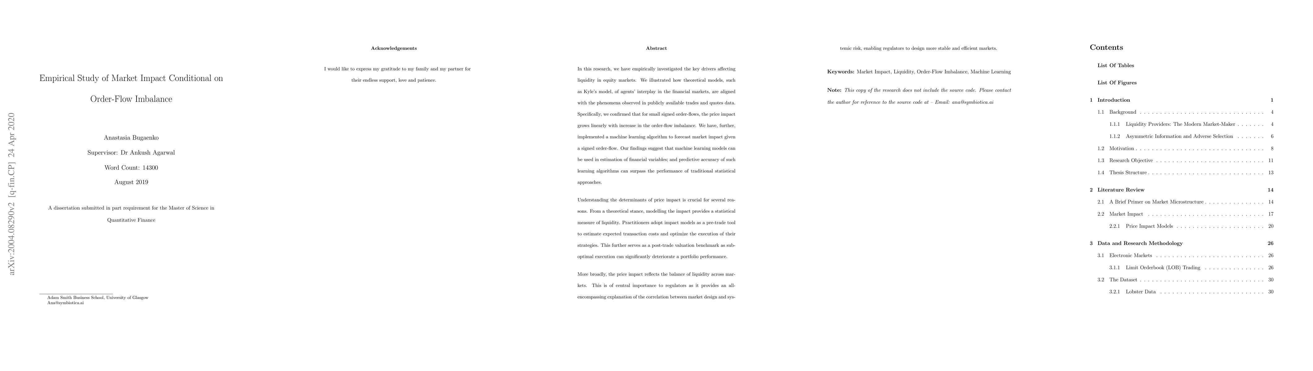 In this research, we have empirically investigated the key drivers affecting liquidity in equity markets. We illustrated how theoretical models, such as Kyle's model, of agents' interplay in the financial markets, are aligned with the phenomena observed in publicly available trades and quotes data. Specifically, we confirmed that for small signed order-flows, the price impact grows linearly with increase in the order-flow imbalance. We have, further, implemented a machine learning algorithm to forecast market impact given a signed order-flow. Our findings suggest that machine learning models can be used in estimation of financial variables; and predictive accuracy of such learning algorithms can surpass the performance of traditional statistical approaches. Understanding the determinants of price impact is crucial for several reasons. From a theoretical stance, modelling the impact provides a statistical measure of liquidity. Practitioners adopt impact models as a pre-trade tool to estimate expected transaction costs and optimize the execution of their strategies. This further serves as a post-trade valuation benchmark as suboptimal execution can significantly deteriorate a portfolio performance. More broadly, the price impact reflects the balance of liquidity across markets. This is of central importance to regulators as it provides an all-encompassing explanation of the correlation between market design and systemic risk, enabling regulators to design more stable and efficient markets.