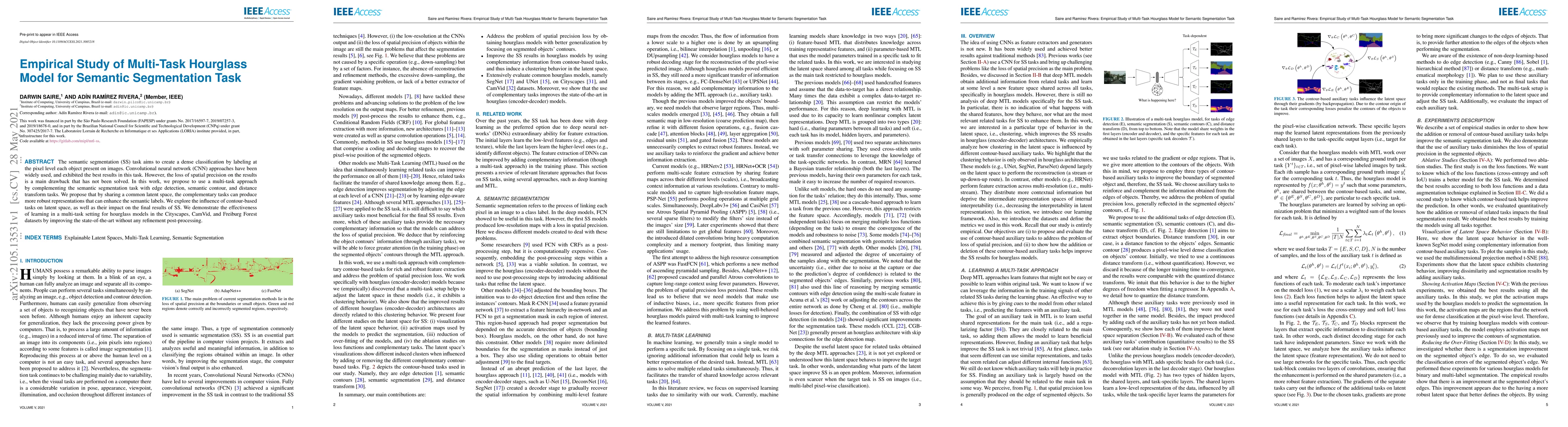 The semantic segmentation (SS) task aims to create a dense classification by labeling at the pixel level each object present on images. Convolutional neural network (CNN) approaches have been widely used, and exhibited the best results in this task. However, the loss of spatial precision on the results is a main drawback that has not been solved. In this work, we propose to use a multi-task approach by complementing the semantic segmentation task with edge detection, semantic contour, and distance transform tasks. We propose that by sharing a common latent space, the complementary tasks can produce more robust representations that can enhance the semantic labels. We explore the influence of contour-based tasks on latent space, as well as their impact on the final results of SS. We demonstrate the effectiveness of learning in a multi-task setting for hourglass models in the Cityscapes, CamVid, and Freiburg Forest datasets by improving the state-of-the-art without any refinement post-processing.