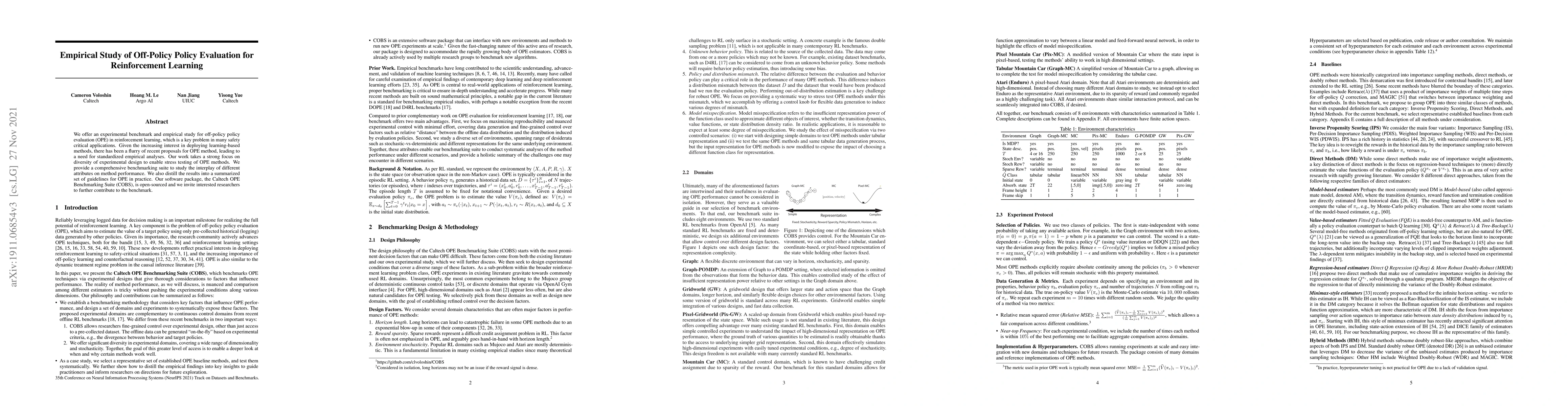 We offer an experimental benchmark and empirical study for off-policy policy evaluation (OPE) in reinforcement learning, which is a key problem in many safety critical applications. Given the increasing interest in deploying learning-based methods, there has been a flurry of recent proposals for OPE method, leading to a need for standardized empirical analyses. Our work takes a strong focus on diversity of experimental design to enable stress testing of OPE methods. We provide a comprehensive benchmarking suite to study the interplay of different attributes on method performance. We distill the results into a summarized set of guidelines for OPE in practice. Our software package, the Caltech OPE Benchmarking Suite (COBS), is open-sourced and we invite interested researchers to further contribute to the benchmark.