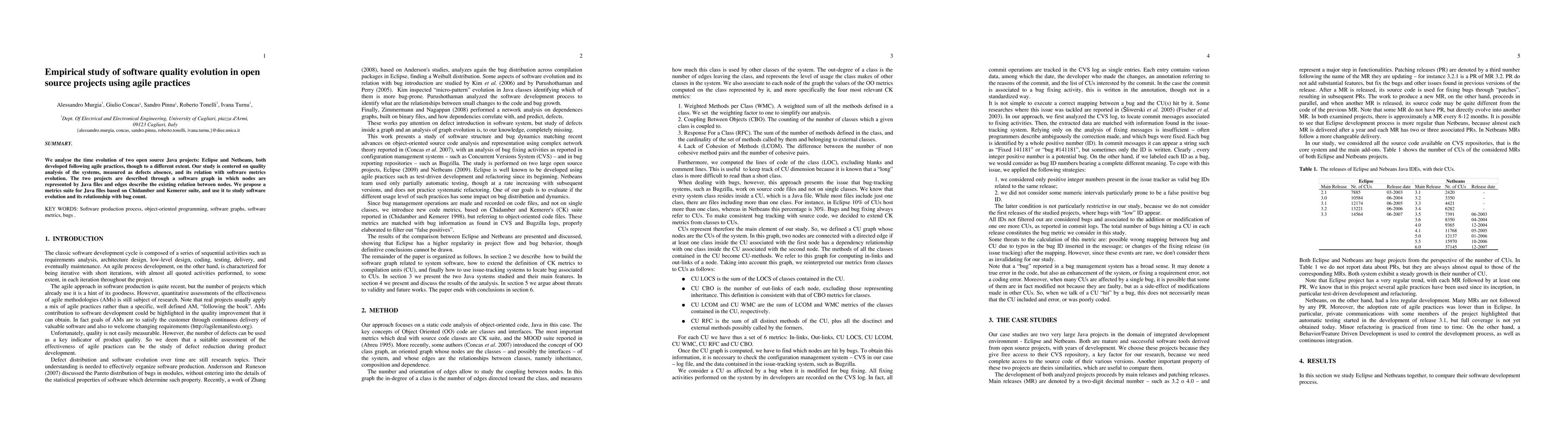 We analyse the time evolution of two open source Java projects: Eclipse and Netbeans, both developed following agile practices, though to a different extent. Our study is centered on quality analysis of the systems, measured as defects absence, and its relation with software metrics evolution. The two projects are described through a software graph in which nodes are represented by Java files and edges describe the existing relation between nodes. We propose a metrics suite for Java files based on Chidamber and Kemerer suite, and use it to study software evolution and its relationship with bug count.