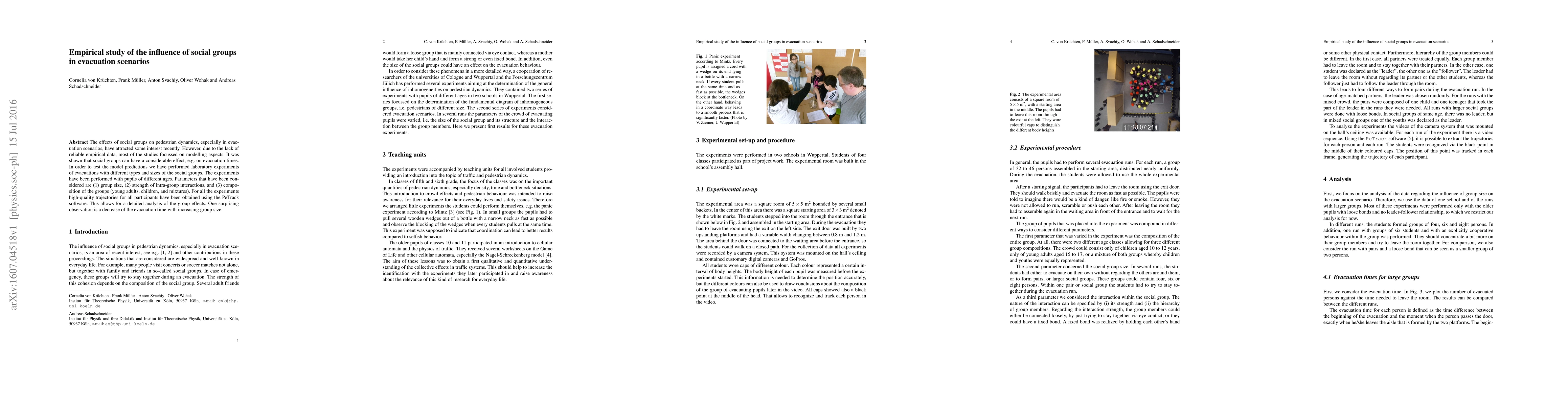 This study investigates the impact of social groups on pedestrian dynamics during evacuations using laboratory experiments with pupils of varying ages. Findings reveal that evacuation times can decrease with larger group sizes, contrary to common expectations, highlighting the complex influence of social interactions.
