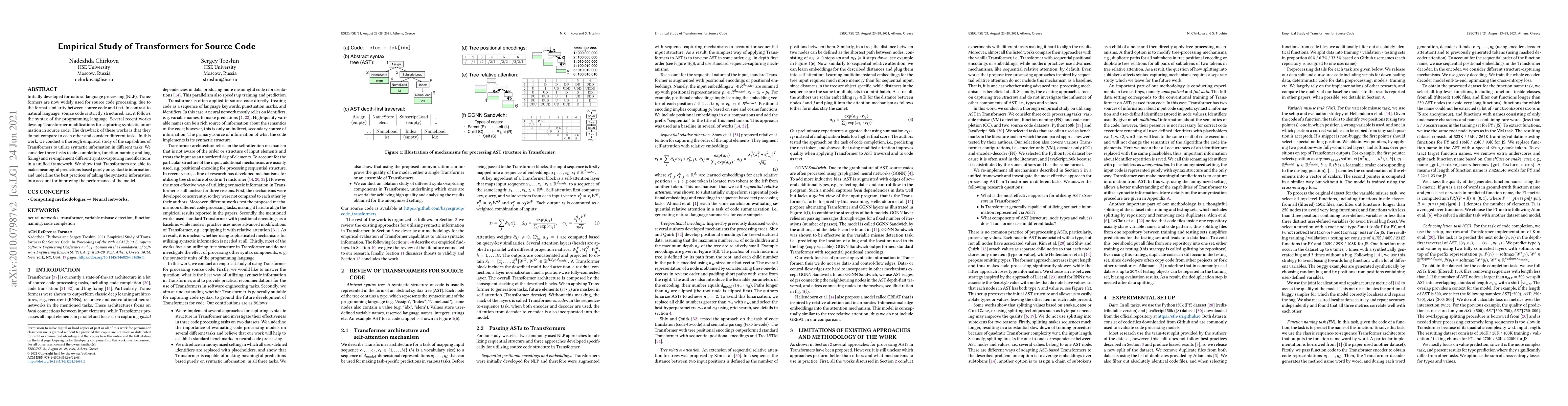 This paper conducts an empirical study on the use of Transformers for source code processing, comparing various syntax-capturing modifications across three tasks: code completion, function naming, and bug fixing. The study highlights that Transformers can effectively utilize syntactic information for meaningful predictions and identifies best practices for incorporating such information.