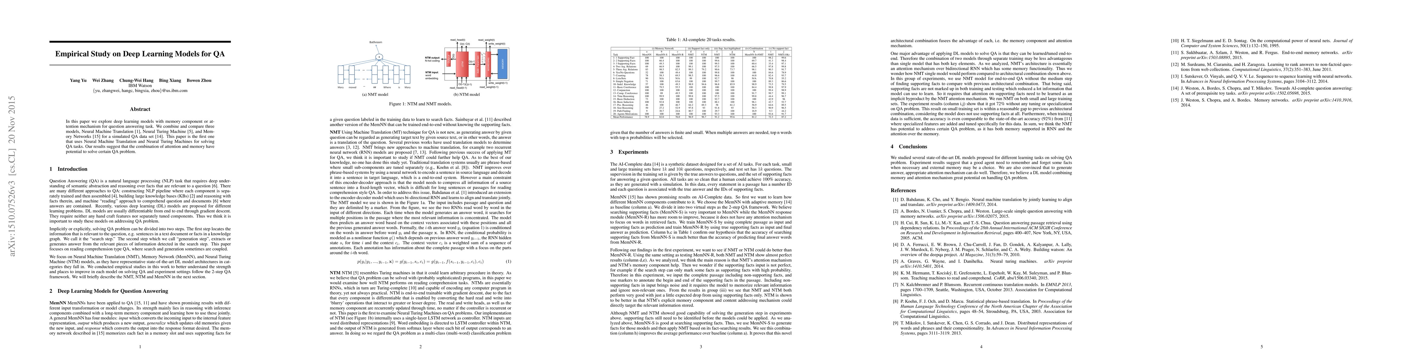 In this paper we explore deep learning models with memory component or attention mechanism for question answering task. We combine and compare three models, Neural Machine Translation, Neural Turing Machine, and Memory Networks for a simulated QA data set. This paper is the first one that uses Neural Machine Translation and Neural Turing Machines for solving QA tasks. Our results suggest that the combination of attention and memory have potential to solve certain QA problem.
