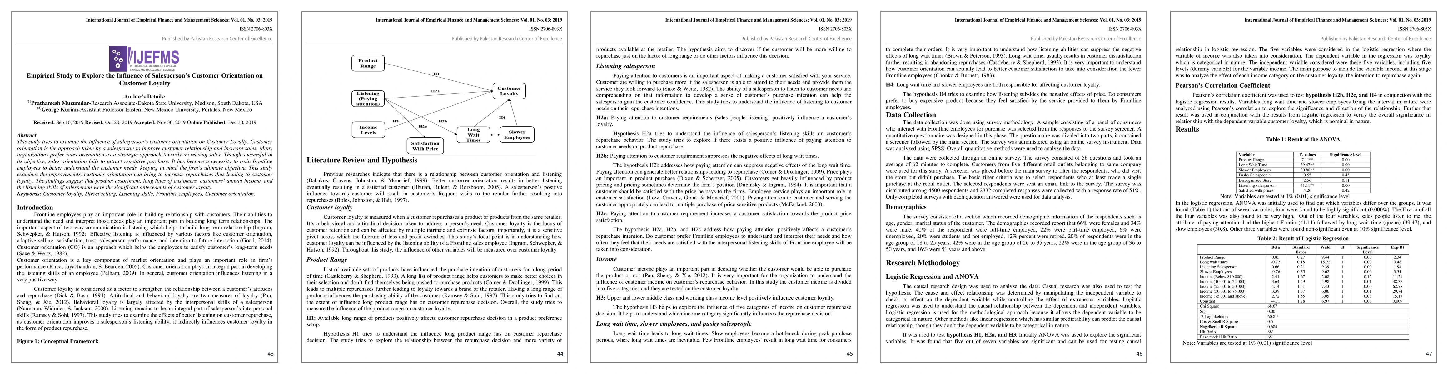 This study investigates how salespersons' customer orientation impacts customer loyalty, finding that it enhances repurchases. Key factors identified include product assortment, long customer lines, annual income, and salesperson listening skills as significant antecedents of customer loyalty.