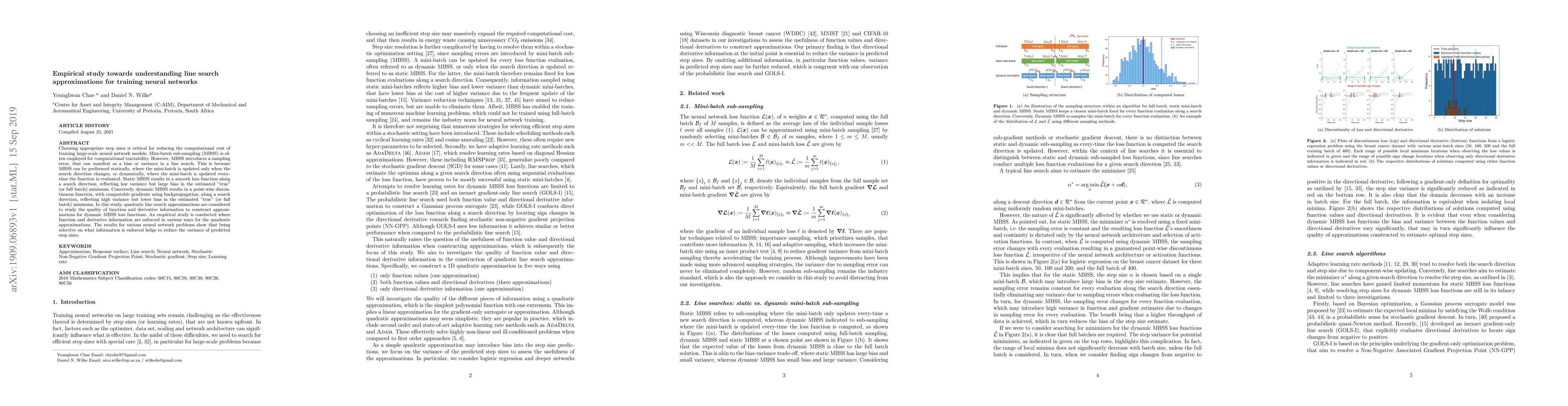 Choosing appropriate step sizes is critical for reducing the computational cost of training large-scale neural network models. Mini-batch sub-sampling (MBSS) is often employed for computational tractability. However, MBSS introduces a sampling error, that can manifest as a bias or variance in a line search. This is because MBSS can be performed statically, where the mini-batch is updated only when the search direction changes, or dynamically, where the mini-batch is updated every-time the function is evaluated. Static MBSS results in a smooth loss function along a search direction, reflecting low variance but large bias in the estimated "true" (or full batch) minimum. Conversely, dynamic MBSS results in a point-wise discontinuous function, with computable gradients using backpropagation, along a search direction, reflecting high variance but lower bias in the estimated "true" (or full batch) minimum. In this study, quadratic line search approximations are considered to study the quality of function and derivative information to construct approximations for dynamic MBSS loss functions. An empirical study is conducted where function and derivative information are enforced in various ways for the quadratic approximations. The results for various neural network problems show that being selective on what information is enforced helps to reduce the variance of predicted step sizes.