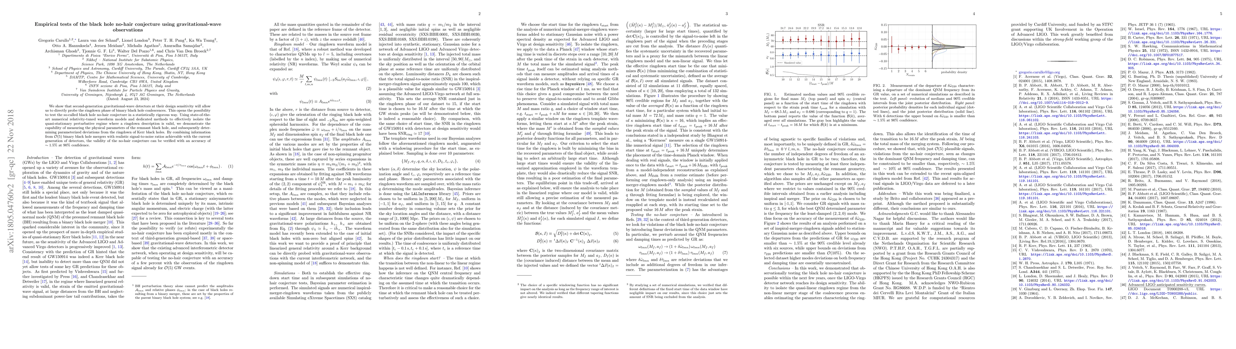 We show that second-generation gravitational-wave detectors at their design sensitivity will allow us to directly probe the ringdown phase of binary black hole coalescences. This opens the possibility to test the so-called black hole no-hair conjecture in a statistically rigorous way. Using state-of-the-art numerical relativity-tuned waveform models and dedicated methods to effectively isolate the quasi-stationary perturbative regime where a ringdown description is valid, we demonstrate the capability of measuring the physical parameters of the remnant black hole, and subsequently determining parameterized deviations from the ringdown of Kerr black holes. By combining information from $\mathcal{O}(5)$ binary black hole mergers with realistic signal-to-noise ratios achievable with the current generation of detectors, the validity of the no-hair conjecture can be verified with an accuracy of $\sim 1.5\%$ at $90\%$ confidence.