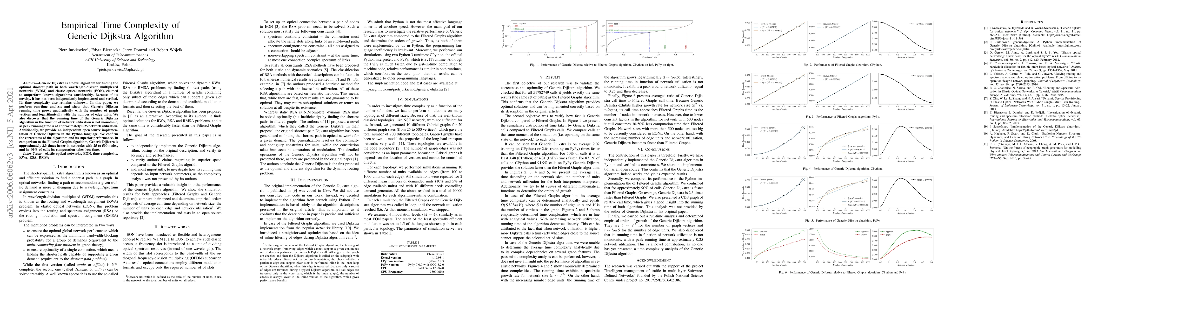 Generic Dijkstra is a novel algorithm for finding the optimal shortest path in both wavelength-division multiplexed networks (WDM) and elastic optical networks (EON), claimed to outperform known algorithms considerably. Because of its novelty, it has not been independently implemented and verified. Its time complexity also remains unknown. In this paper, we perform run-time analysis and show that Generic Dijkstra running time grows quadratically with the number of graph vertices and logarithmically with the number of edge units. We also discover that the running time of the Generic Dijkstra algorithm in the function of network utilization is not monotonic, as peak running time is at approximately 0.25 network utilization. Additionally, we provide an independent open source implementation of Generic Dijkstra in the Python language. We confirm the correctness of the algorithm and its superior performance. In comparison to the Filtered Graphs algorithm, Generic Dijkstra is approximately 2.3 times faster in networks with 25 to 500 nodes, and in 90% of calls its computation takes less time.