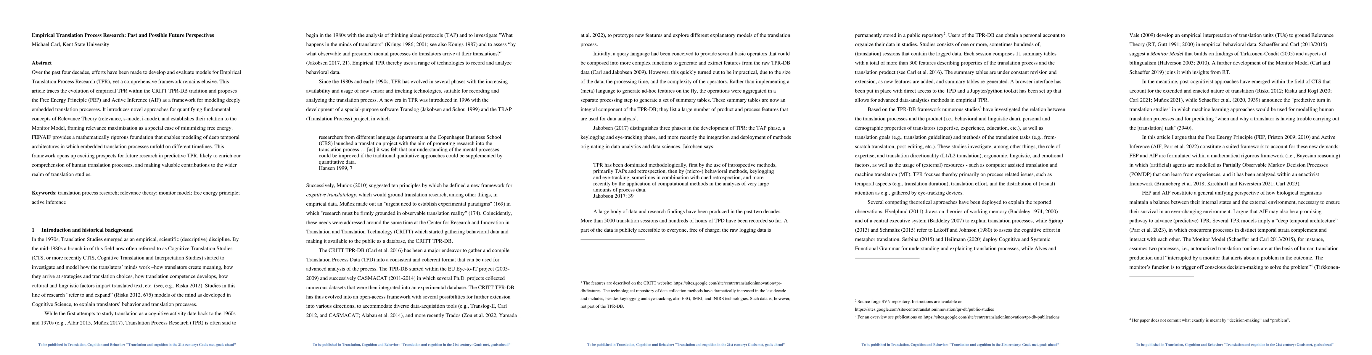 This paper reviews the evolution of empirical translation process research (TPR) and proposes the Free Energy Principle (FEP) and Active Inference (AIF) as a new framework for modeling deeply embedded translation processes. It introduces novel quantification methods for Relevance Theory concepts and suggests a mathematically rigorous foundation for predictive TPR, promising advancements in understanding human translation and cognitive architecture design.