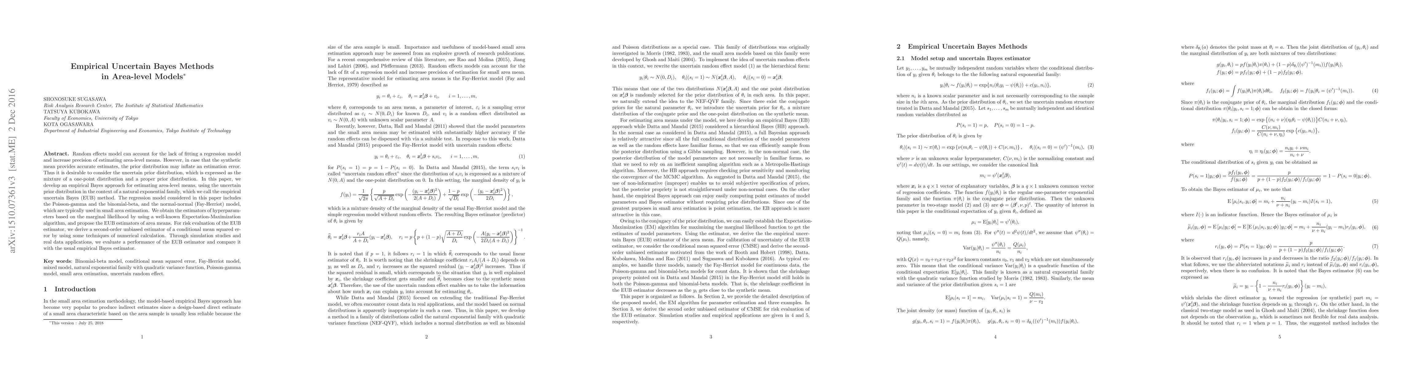 This paper develops an empirical uncertain Bayes (EUB) method for estimating area-level means in random effects models, addressing inflated estimation errors from prior distributions. It uses the Expectation-Maximization algorithm to estimate hyperparameters and compares the EUB estimator's performance against the usual empirical Bayes estimator through simulations and real data applications.