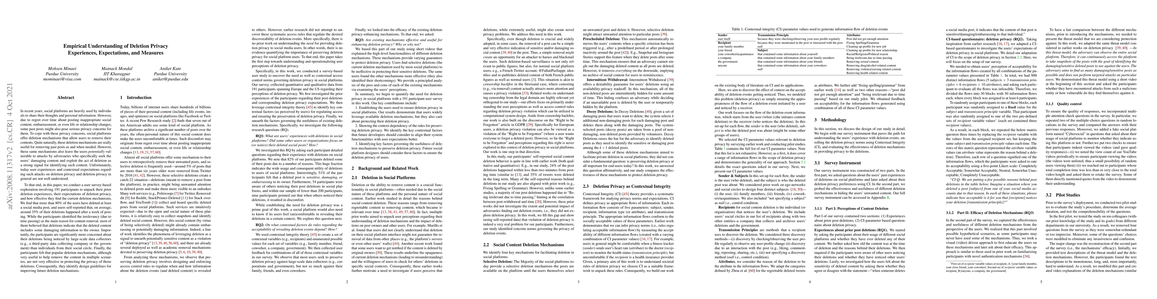 Social platforms are heavily used by individuals to share their thoughts and personal information. However, due to regret over time about posting inappropriate social content, embarrassment, or even life or relationship changes, some past posts might also pose serious privacy concerns for them. To cope with these privacy concerns, social platforms offer deletion mechanisms that allow users to remove their contents. Quite naturally, these deletion mechanisms are really useful for removing past posts as and when needed. However, these same mechanisms also leave the users potentially vulnerable to attacks by adversaries who specifically seek the users' damaging content and exploit the act of deletion as a strong signal for identifying such content. Unfortunately, today user experiences and contextual expectations regarding such attacks on deletion privacy and deletion privacy in general are not well understood. To that end, in this paper, we conduct a user survey-based exploration involving 191 participants to unpack their prior deletion experiences, their expectations of deletion privacy, and how effective they find the current deletion mechanisms. We find that more than 80% of the users have deleted at least a social media post, and users self-reported that, on average, around 35% of their deletions happened after a week of posting. While the participants identified the irrelevancy (due to time passing) as the main reason for content removal, most of them believed that deletions indicate that the deleted content includes some damaging information to the owner. Importantly, the participants are significantly more concerned about their deletions being noticed by large-scale data collectors (e.g., the government) than individuals from their social circle. Finally, the participants felt that popular deletion mechanisms are not very effective in protecting the privacy of those deletions.