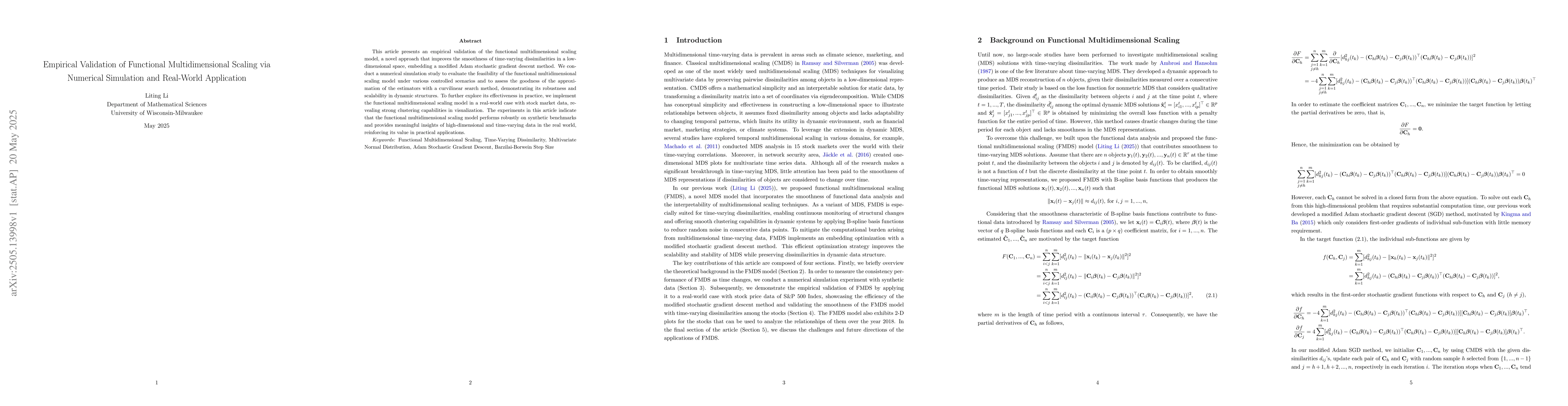 This article presents an empirical validation of the functional multidimensional scaling model, a novel approach that improves the smoothness of time-varying dissimilarities in a low-dimensional space, embedding a modified Adam stochastic gradient descent method. We conduct a numerical simulation study to evaluate the feasibility of the functional multidimensional scaling model under various controlled scenarios and to assess the goodness of the approximation of the estimators with a curvilinear search method, demonstrating its robustness and scalability in dynamic structures. To further explore its effectiveness in practice, we implement the functional multidimensional scaling model in a real-world case with stock market data, revealing strong clustering capabilities in visualization. The experiments in this article indicate that the functional multidimensional scaling model performs robustly on synthetic benchmarks and provides meaningful insights of high-dimensional and time-varying data in the real world, reinforcing its value in practical applications.