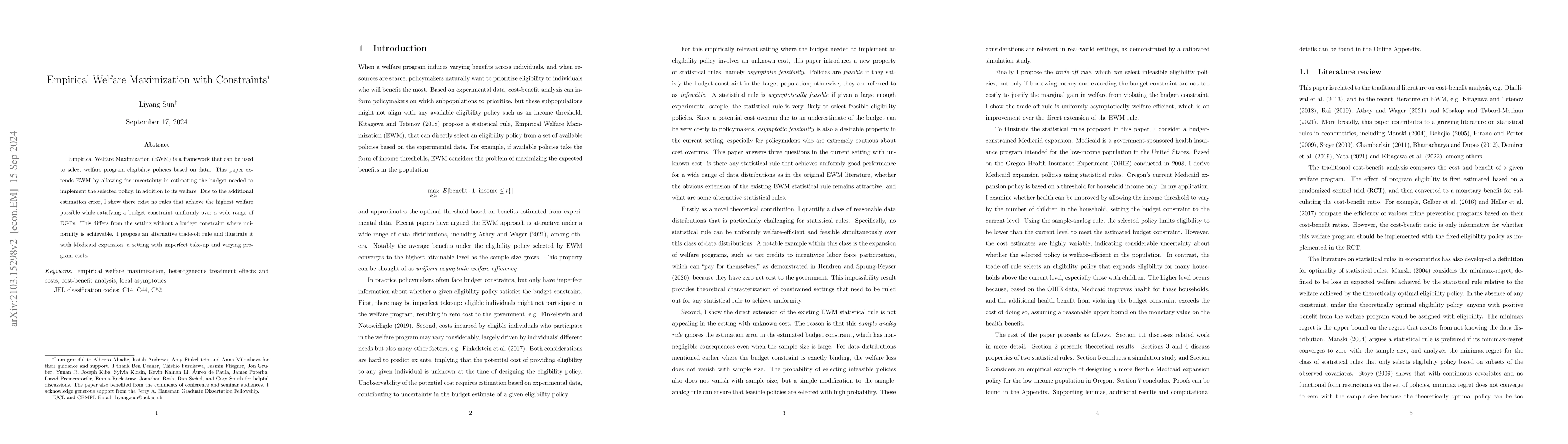When designing eligibility criteria for welfare programs, policymakers naturally want to target the individuals who will benefit the most. This paper proposes two new econometric approaches to selecting an optimal eligibility criterion when individuals' costs to the program are unknown and need to be estimated. One is designed to achieve the highest benefit possible while satisfying a budget constraint with high probability. The other is designed to optimally trade off the benefit and the cost from violating the budget constraint. The setting I consider extends the previous literature on Empirical Welfare Maximization by allowing for uncertainty in estimating the budget needed to implement the criterion, in addition to its benefit. Consequently, my approaches improve the existing approach as they can be applied to settings with imperfect take-up or varying program needs. I illustrate my approaches empirically by deriving an optimal budget-constrained Medicaid expansion in the US.