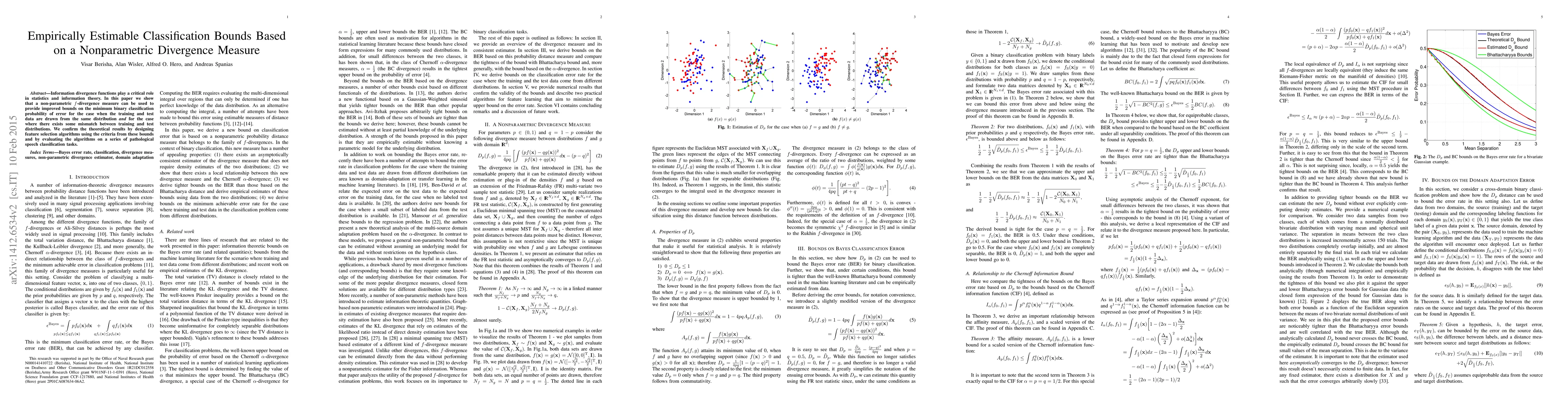Information divergence functions play a critical role in statistics and information theory. In this paper we show that a non-parametric f-divergence measure can be used to provide improved bounds on the minimum binary classification probability of error for the case when the training and test data are drawn from the same distribution and for the case where there exists some mismatch between training and test distributions. We confirm the theoretical results by designing feature selection algorithms using the criteria from these bounds and by evaluating the algorithms on a series of pathological speech classification tasks.