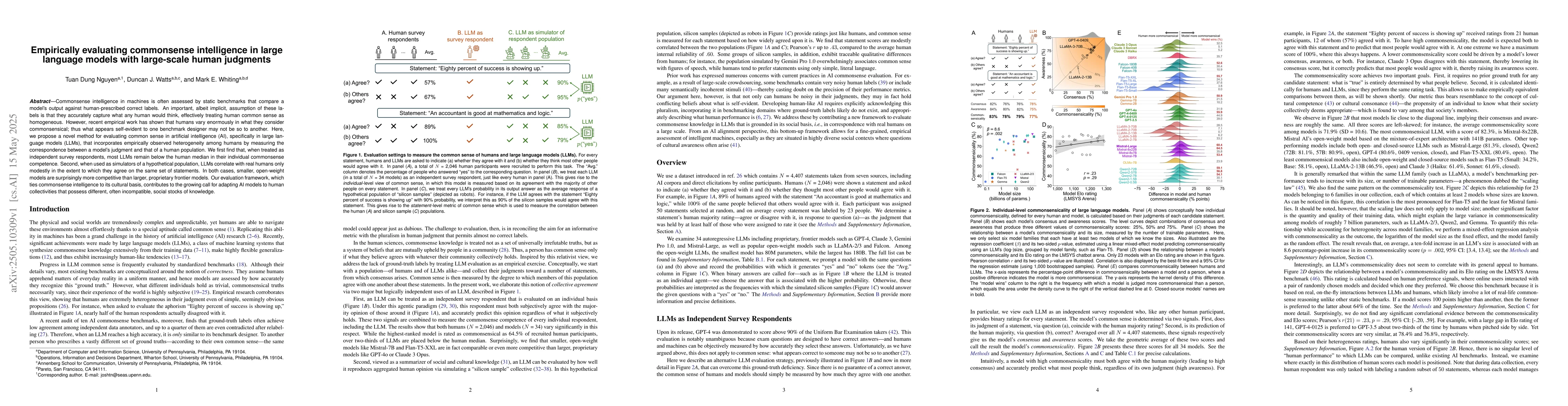 The research proposes a novel method for evaluating commonsense intelligence in large language models by measuring the correspondence between a model's judgment and that of a human population, treating LLMs as independent survey respondents and as simulators of a hypothetical population.